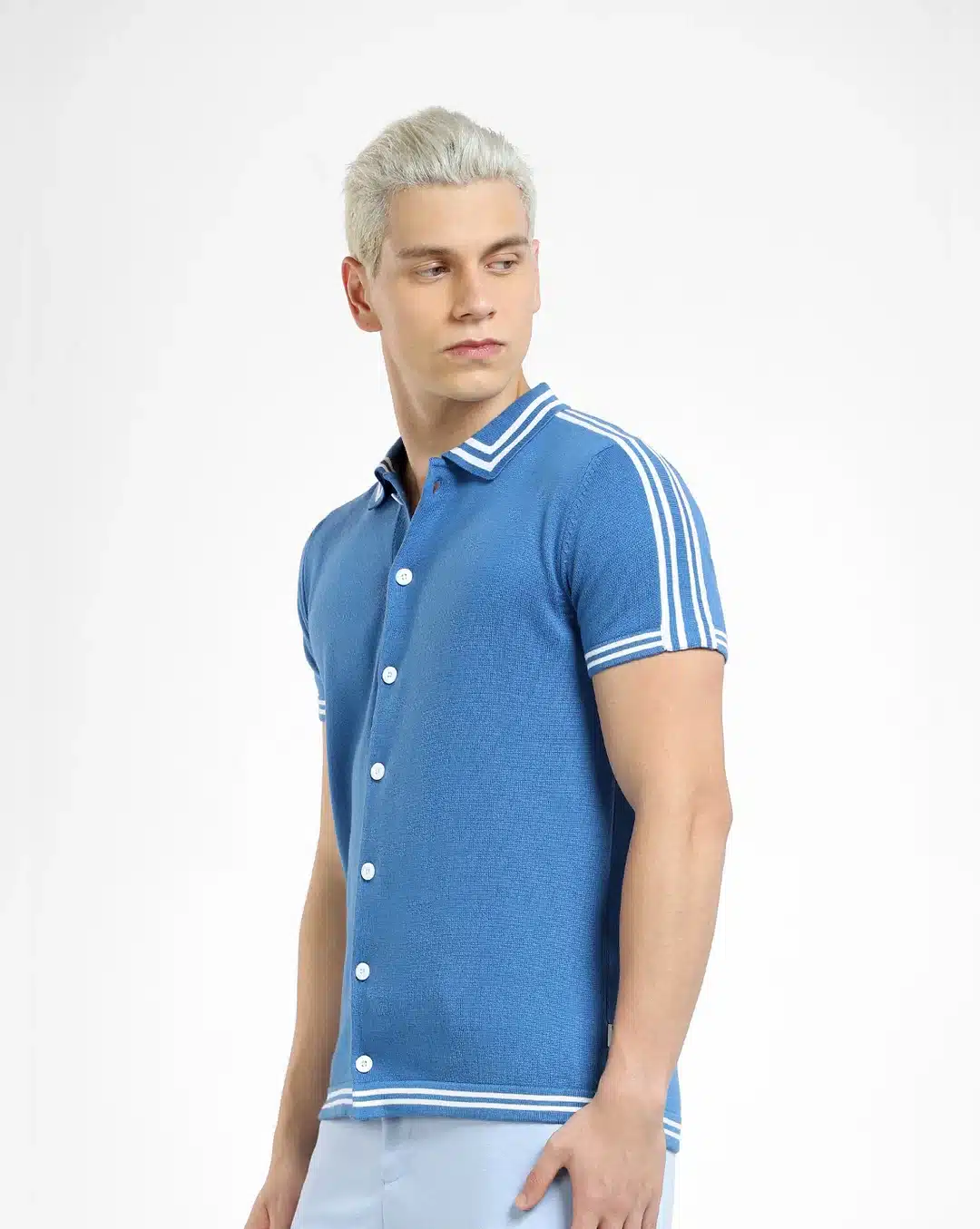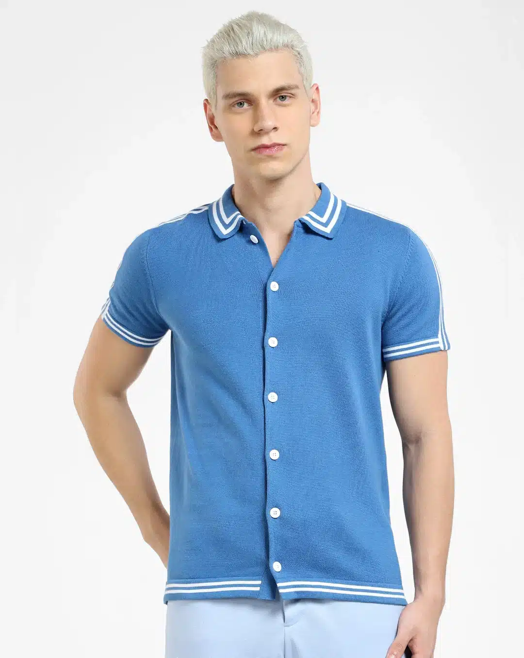 Elevate your wardrobe with our Blue Front Open Knit Polo T-shirt and make a stylish statement wherever you go. Embrace comfort, versatility, and effortless sophistication with this must-have garment that’s sure to become a go-to favorite in your collection.