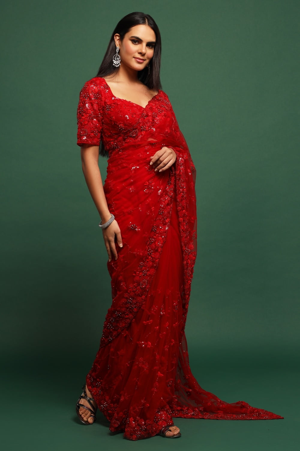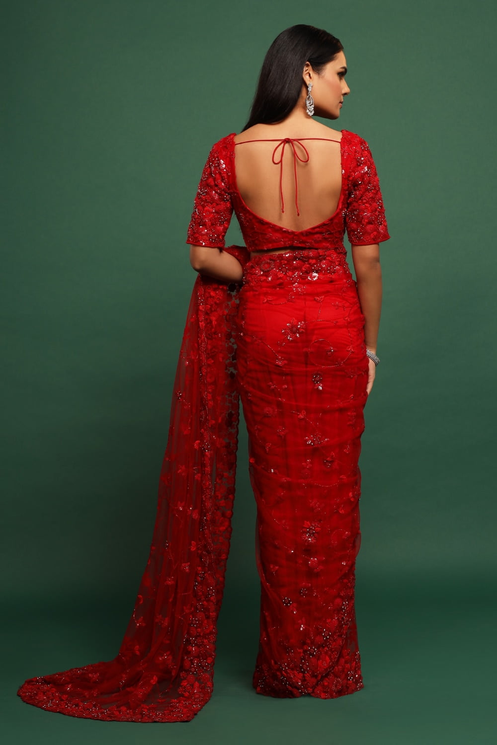 The rich deep red hue of the saree adds a touch of drama and romance, while the sequin highlights add a subtle sparkle and shine. Paired with a matching embroidered blouse, this saree set is perfect for weddings, parties, and festive celebrations.