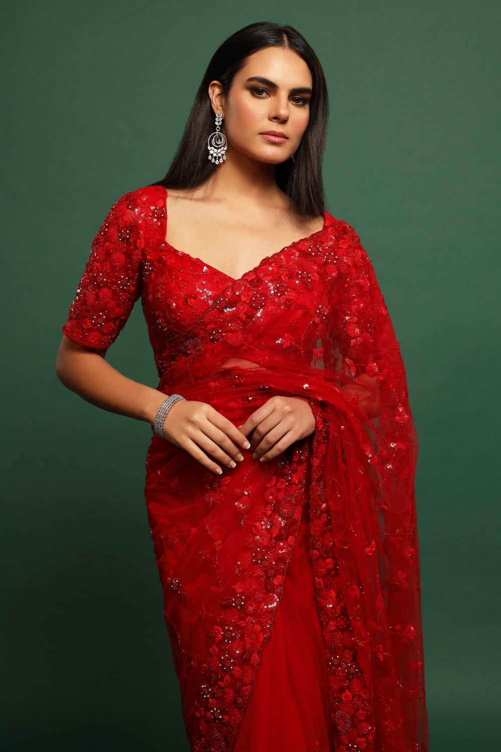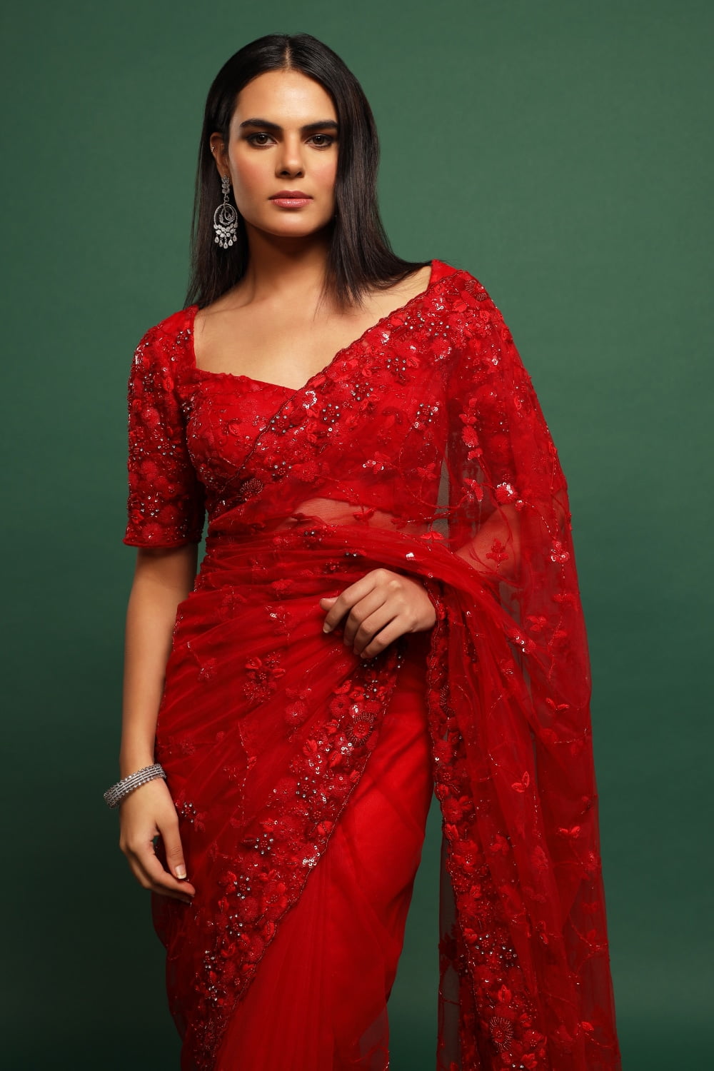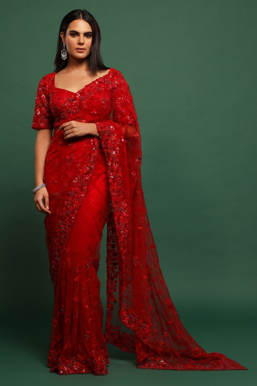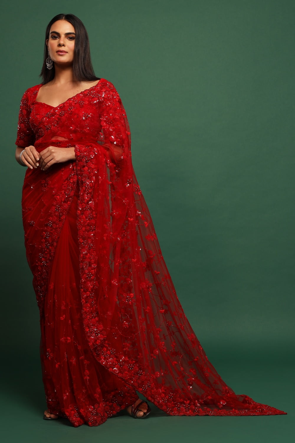 Deep Red Classic Tulle Saree Set, a timeless ensemble that exudes elegance and sophistication. Crafted from luxurious tulle fabric, this saree drapes gracefully and feels lightweight and airy against the skin, ensuring comfort and style throughout the day.