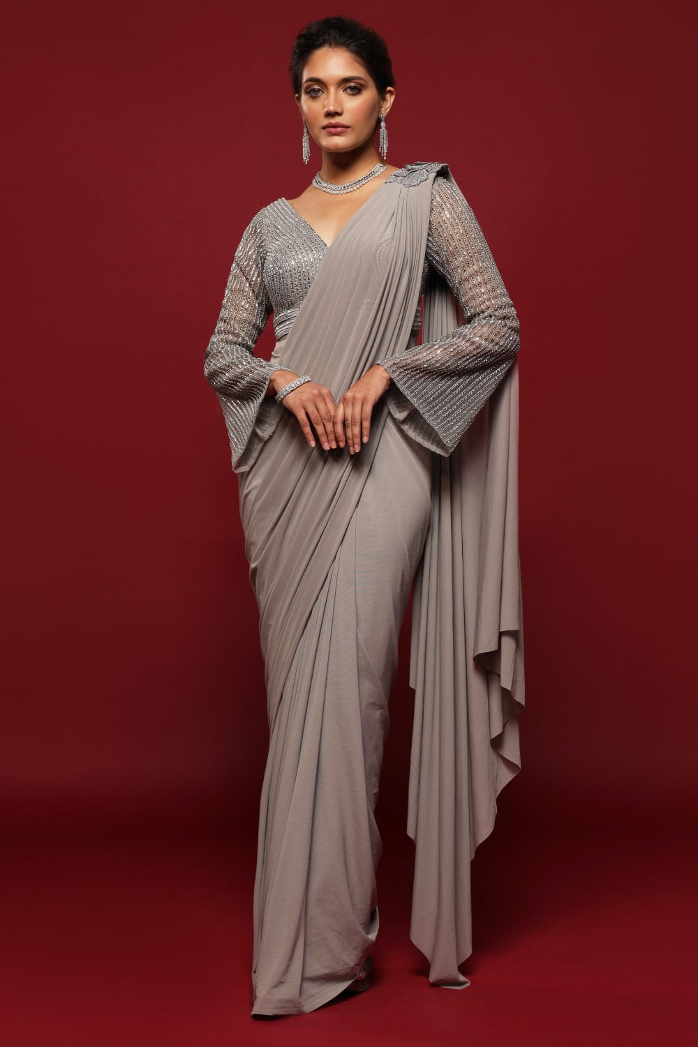 The Dusty Grey Pre-stitched Draped Saree Gown Set is a modern interpretation of the traditional Indian saree. It features a unique design where the saree is pre-stitched to resemble a gown, making it easier to wear compared to a traditional saree. The color “dusty grey” likely refers to a muted, soft shade of grey.