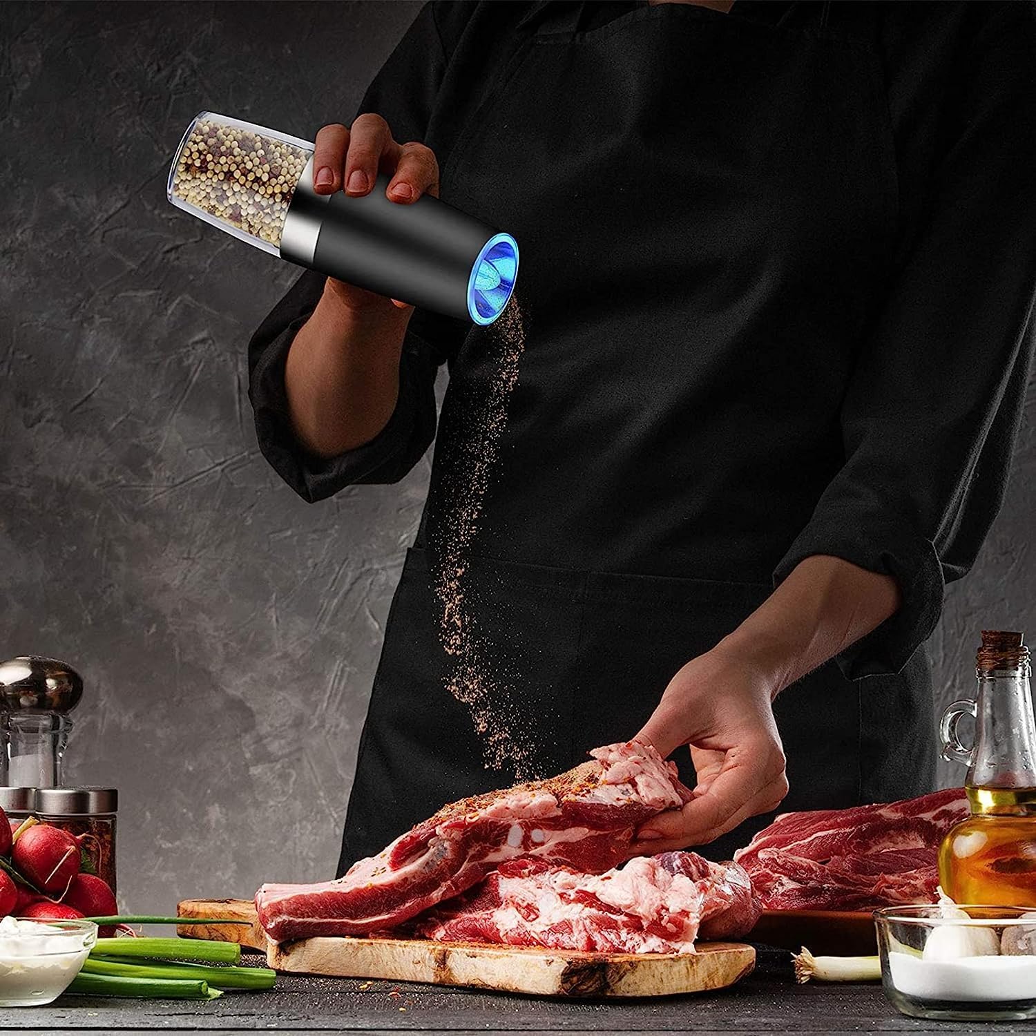 Powered by batteries and featuring an automatic operation, simply tilt the grinder upside down and let gravity do the work. The built-in blue LED light adds a touch of sophistication to your dining experience, illuminating your seasoning for precise control, even in low-light conditions.