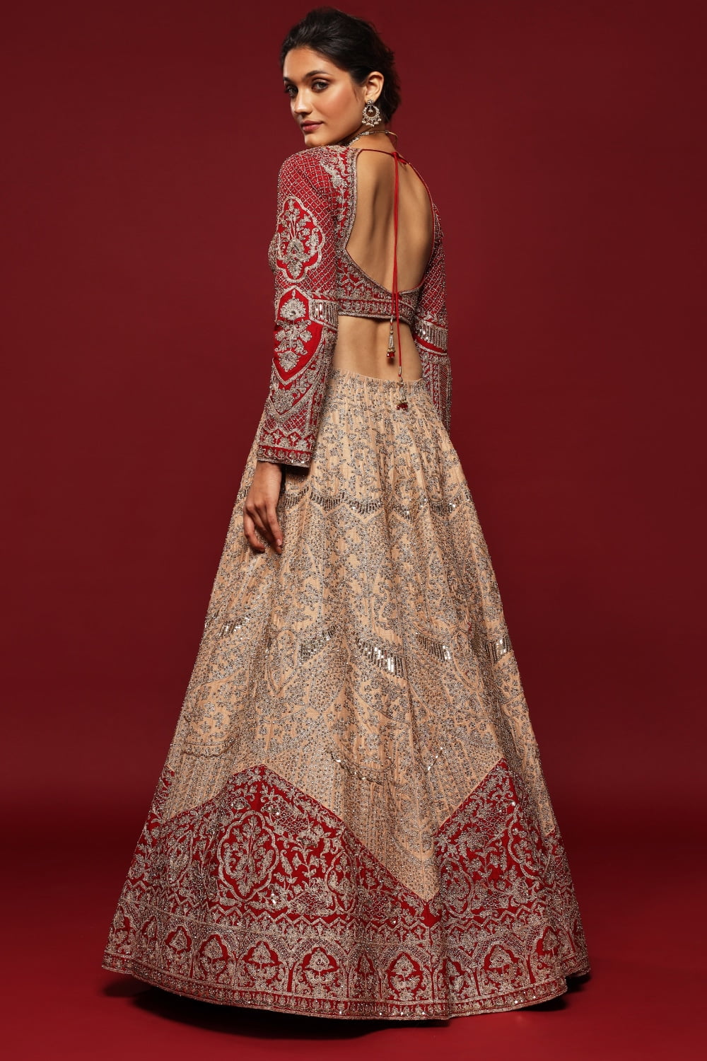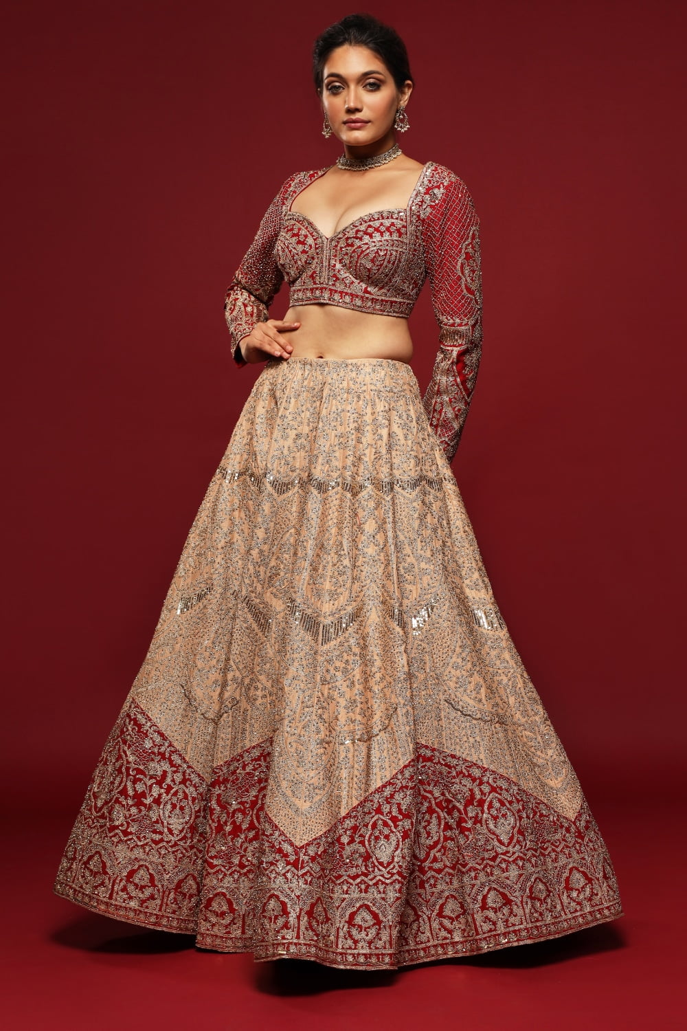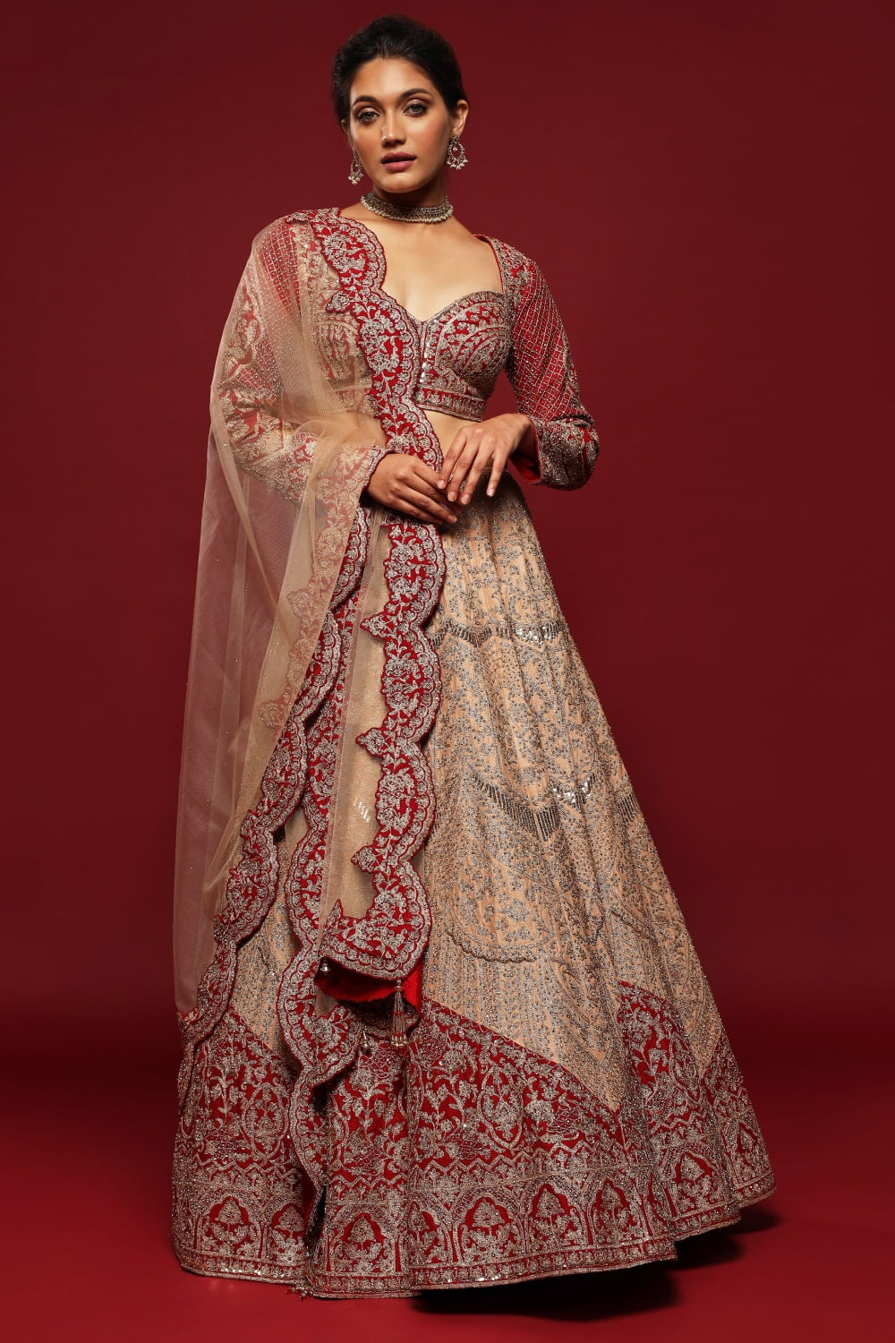 The lehenga, adorned with intricate embroidery, showcases a beautiful contrast of colors, with a rich red blouse complemented by pale gold highlights. This juxtaposition creates a striking visual effect, drawing the eye and adding depth to the ensemble.