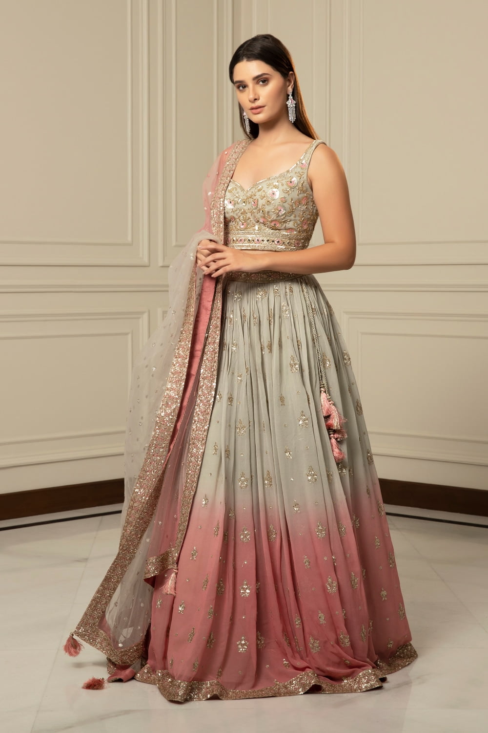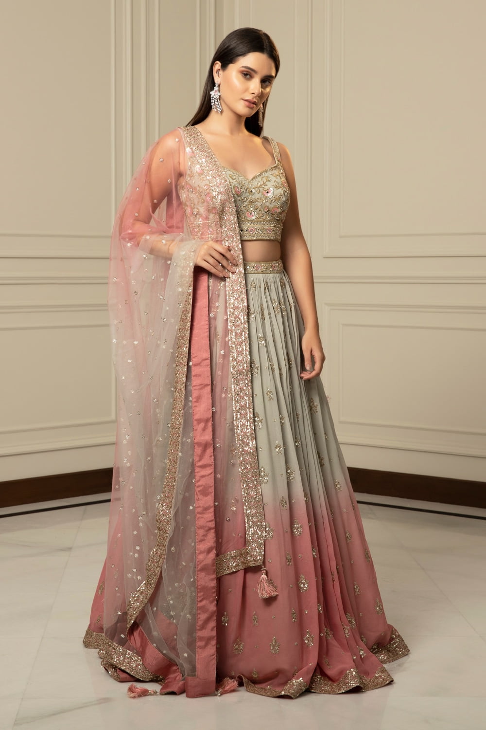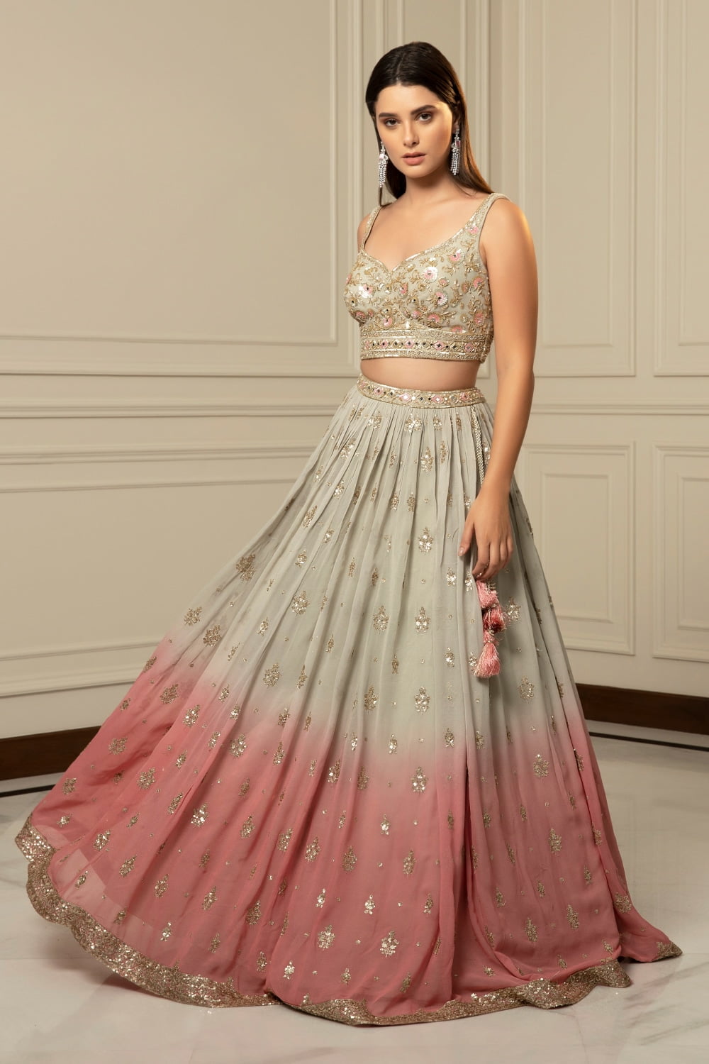 The lehenga transitions seamlessly from a soft grey hue to a delicate peach shade, creating a mesmerizing ombré effect that exudes ethereal beauty. Adorned with intricate sequinned floral details, the lehenga is a true work of art, adding a touch of whimsy and charm to your ensemble.