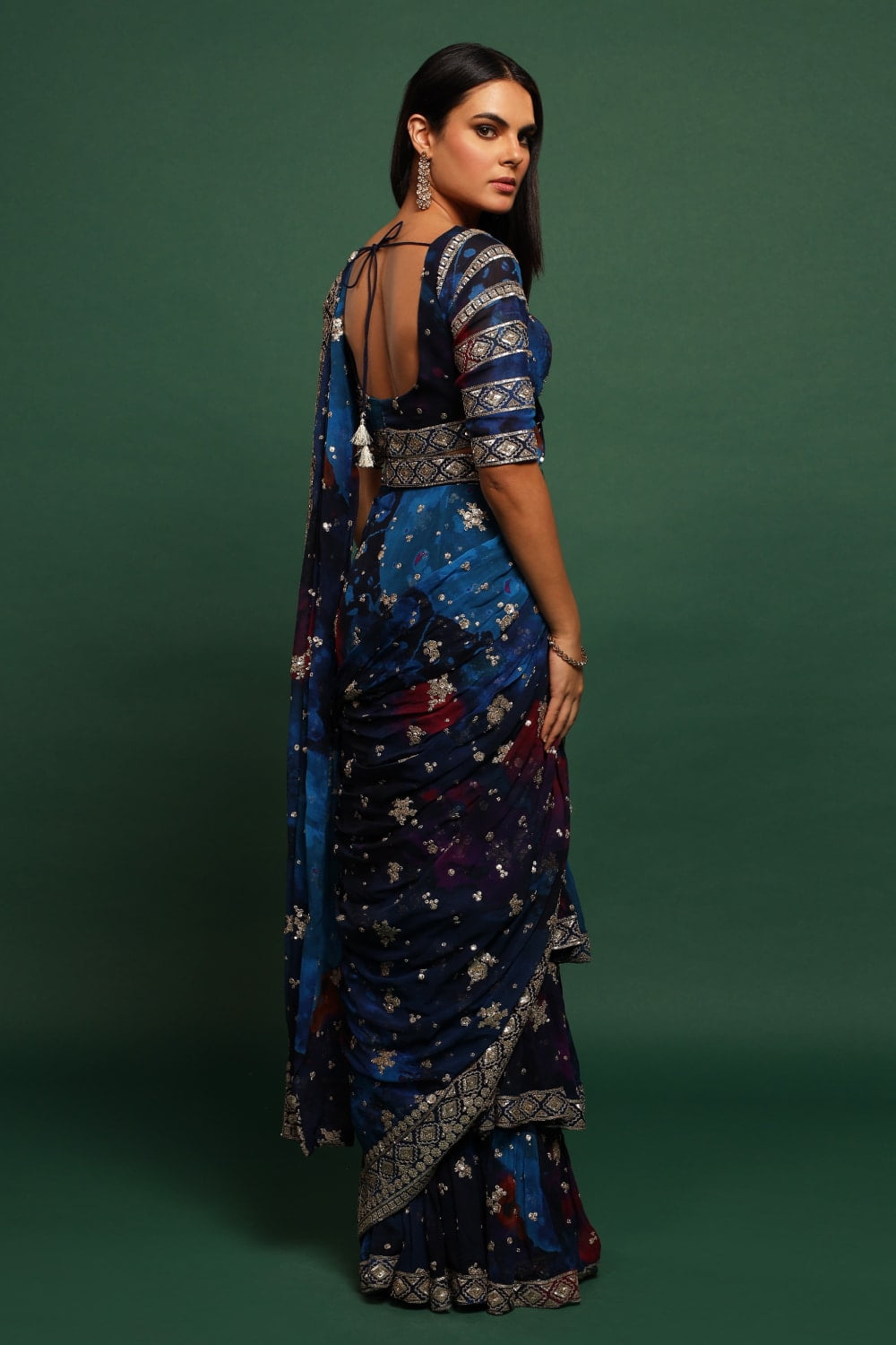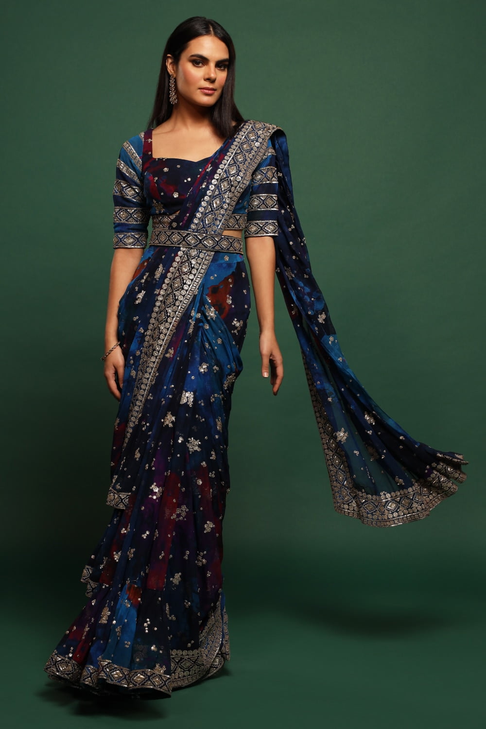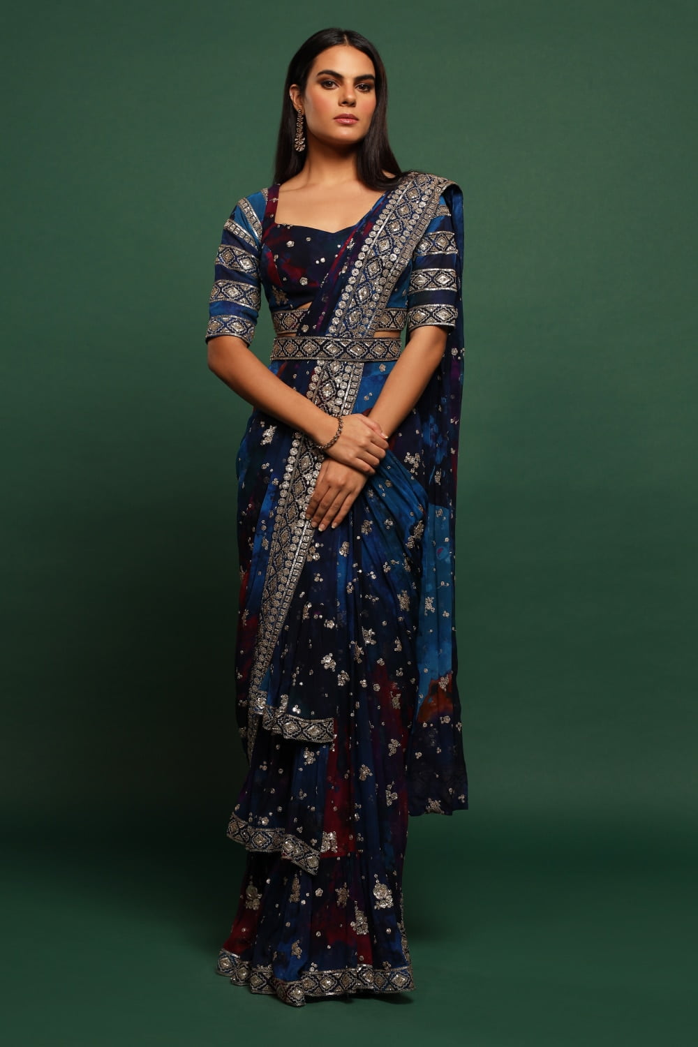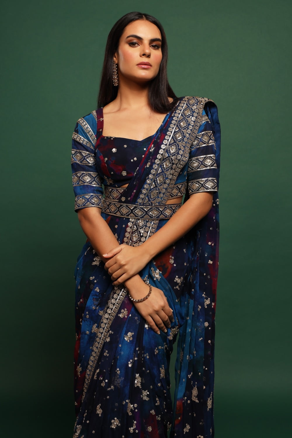 The rich ink blue hue of the saree adds depth and allure, while the pre-stitched design with tiered ruffles offers a modern twist on the classic saree silhouette. The abstract print features vibrant colors and intricate patterns, creating a dynamic and eye-catching look that is sure to turn heads.