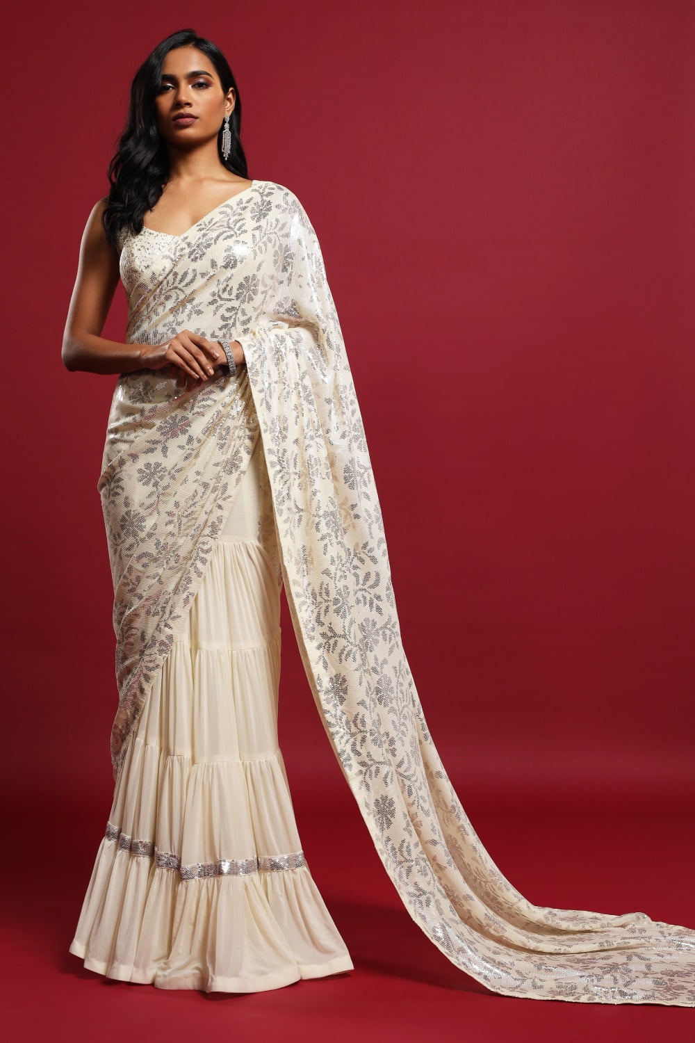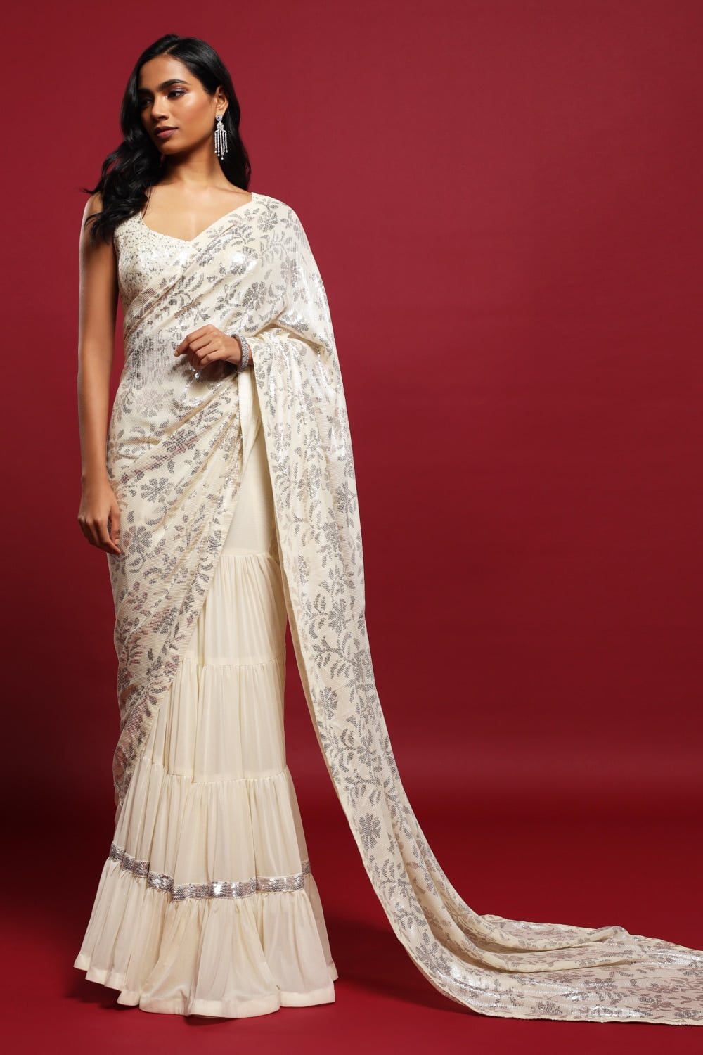 Whether you’re attending a wedding, a festive celebration, or a special event, our Ivory White Classic Tiered Saree Set is sure to make you stand out with effortless elegance. Embrace the timeless allure of ivory white and the glamour of sequins, and step into every occasion with confidence and grace.