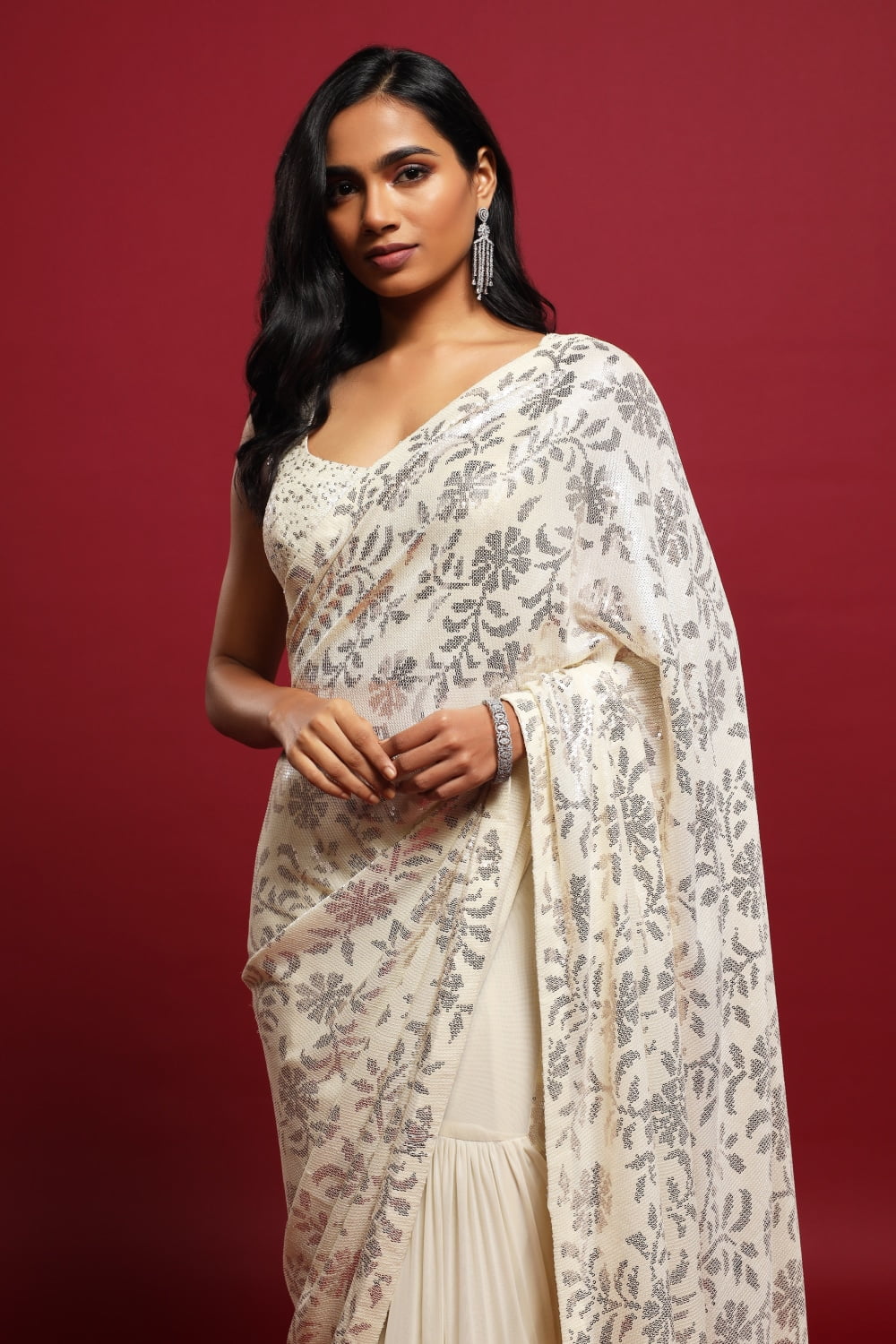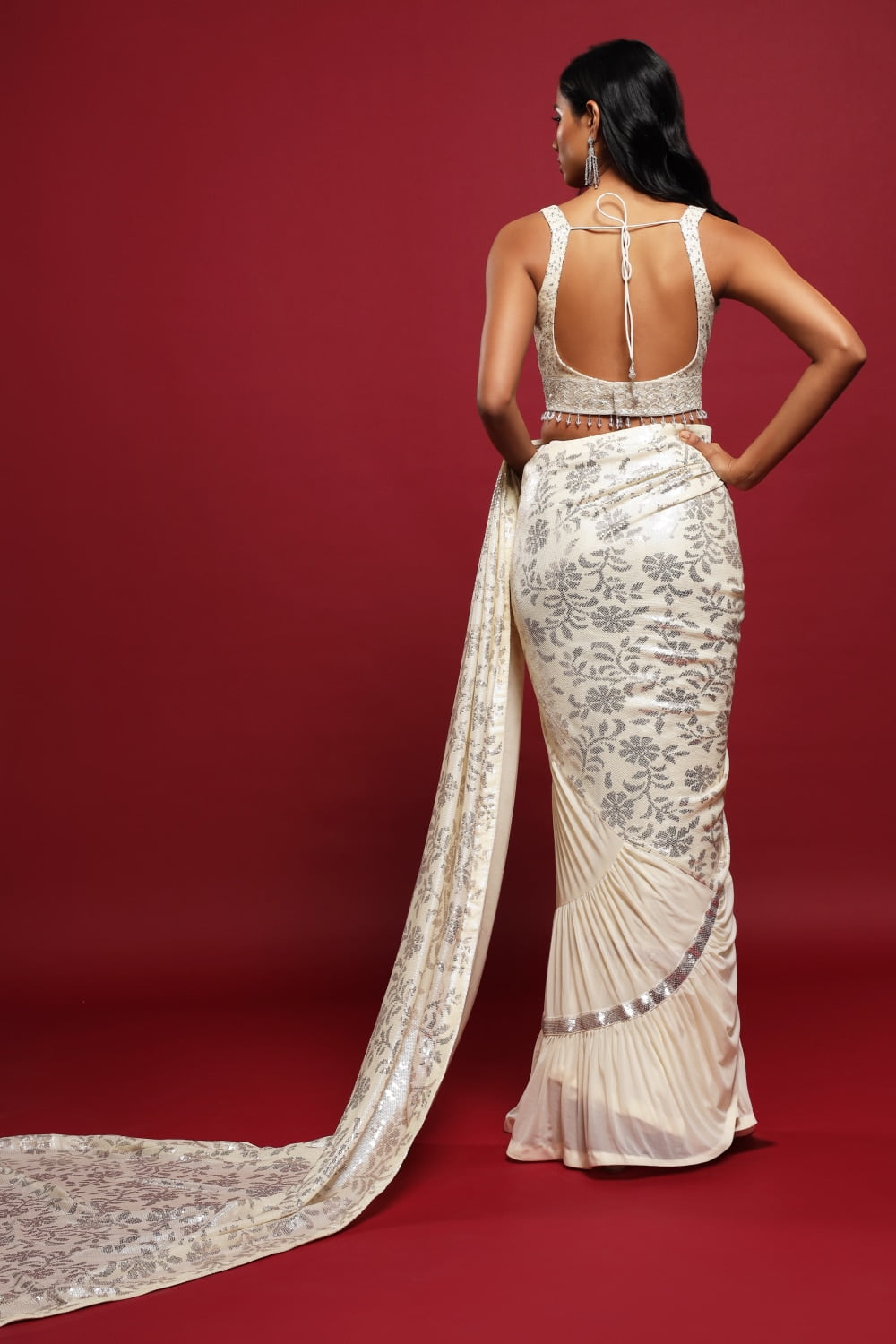 Paired with a matching blouse, this saree set exudes opulence and style. The sequin detailing on the blouse adds a touch of drama, while the classic ivory white hue adds a timeless charm to the overall look.