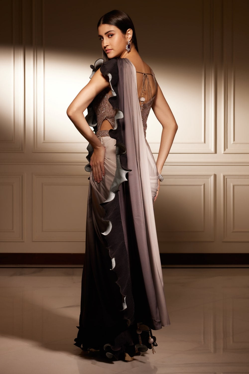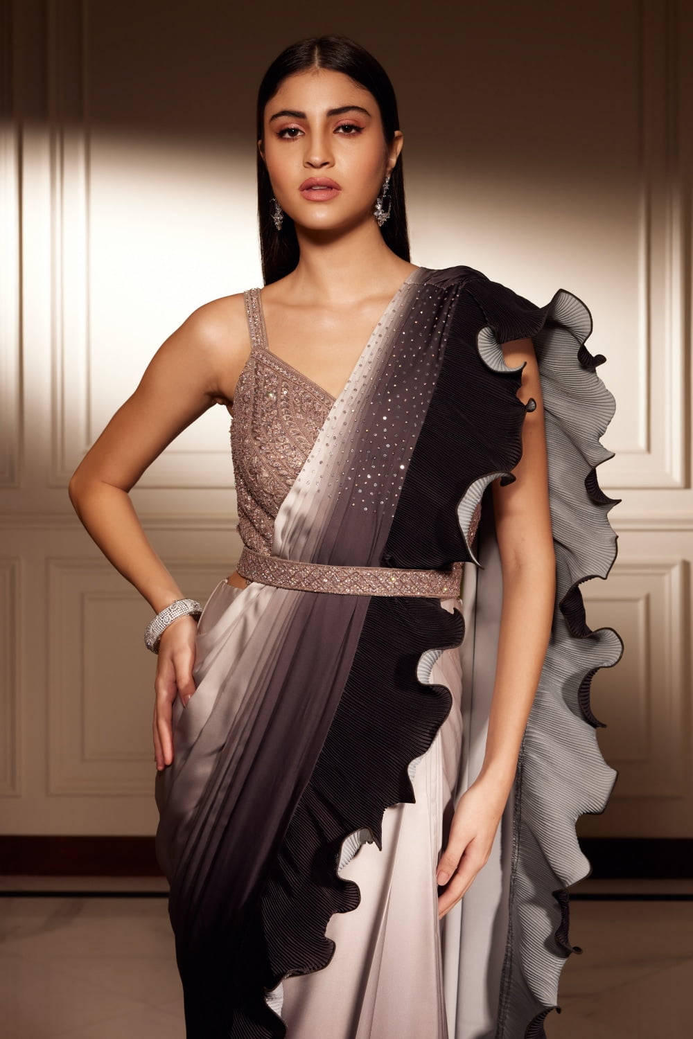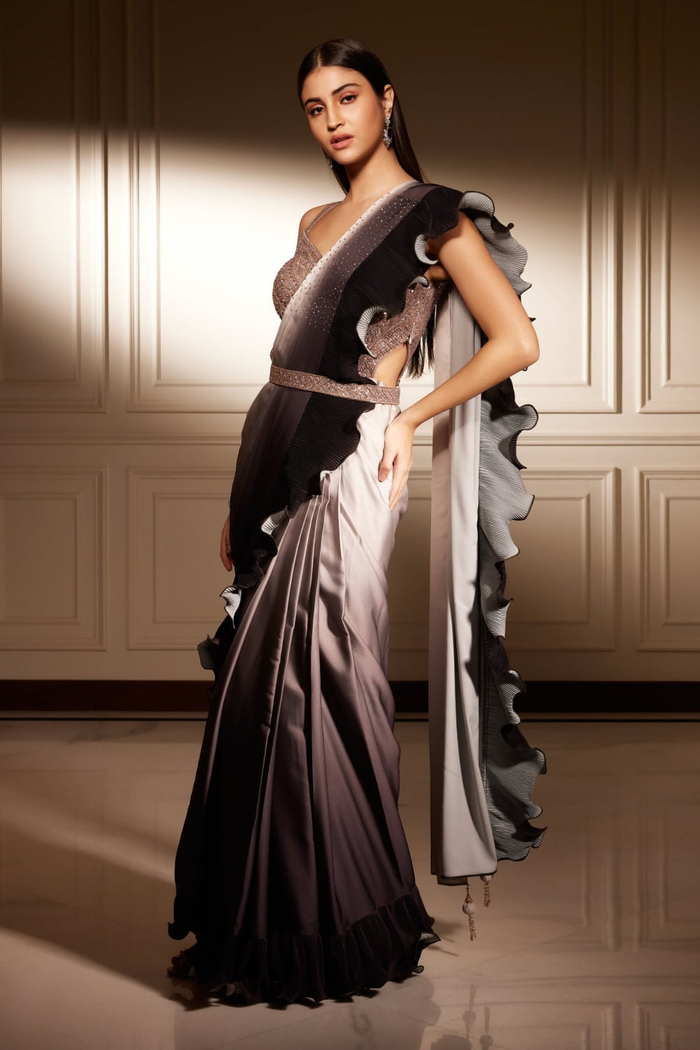 Lavender Purple Ombré Pre-Stitched Draped Saree Gown Set, a fusion of traditional saree elegance and modern gown sophistication. Crafted with meticulous attention to detail, this ensemble is designed to make you feel like royalty on any special occasion.