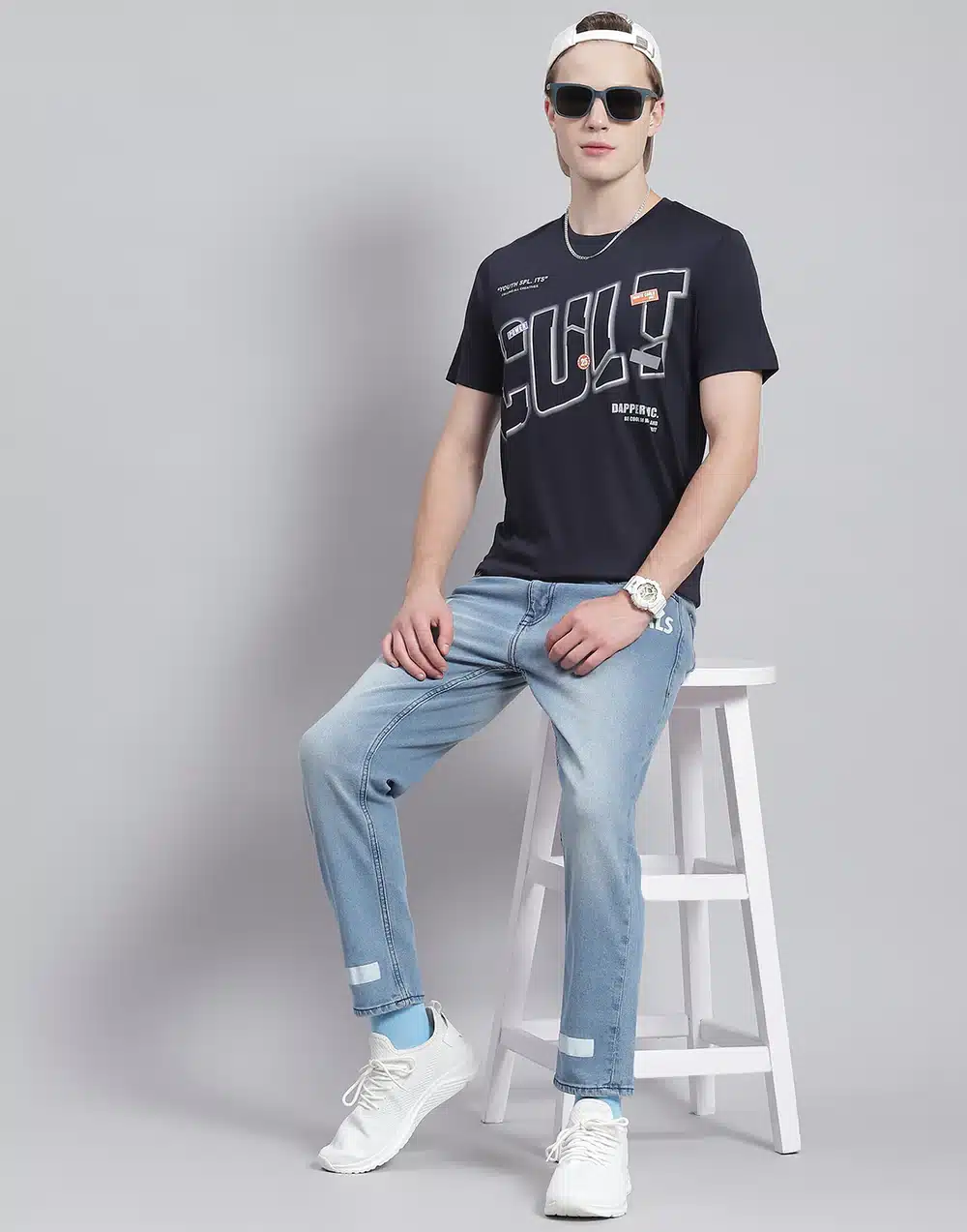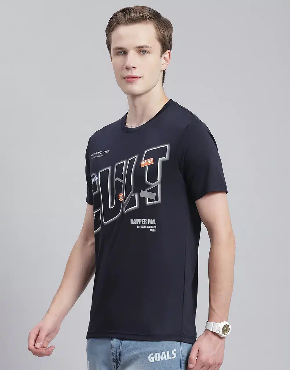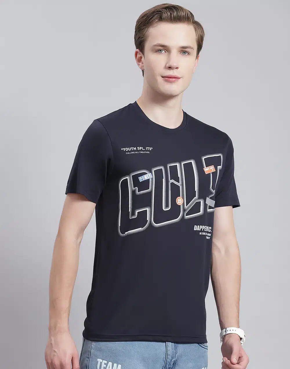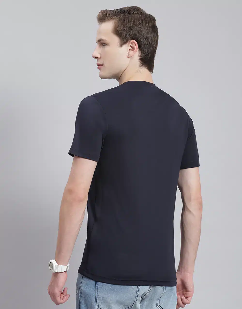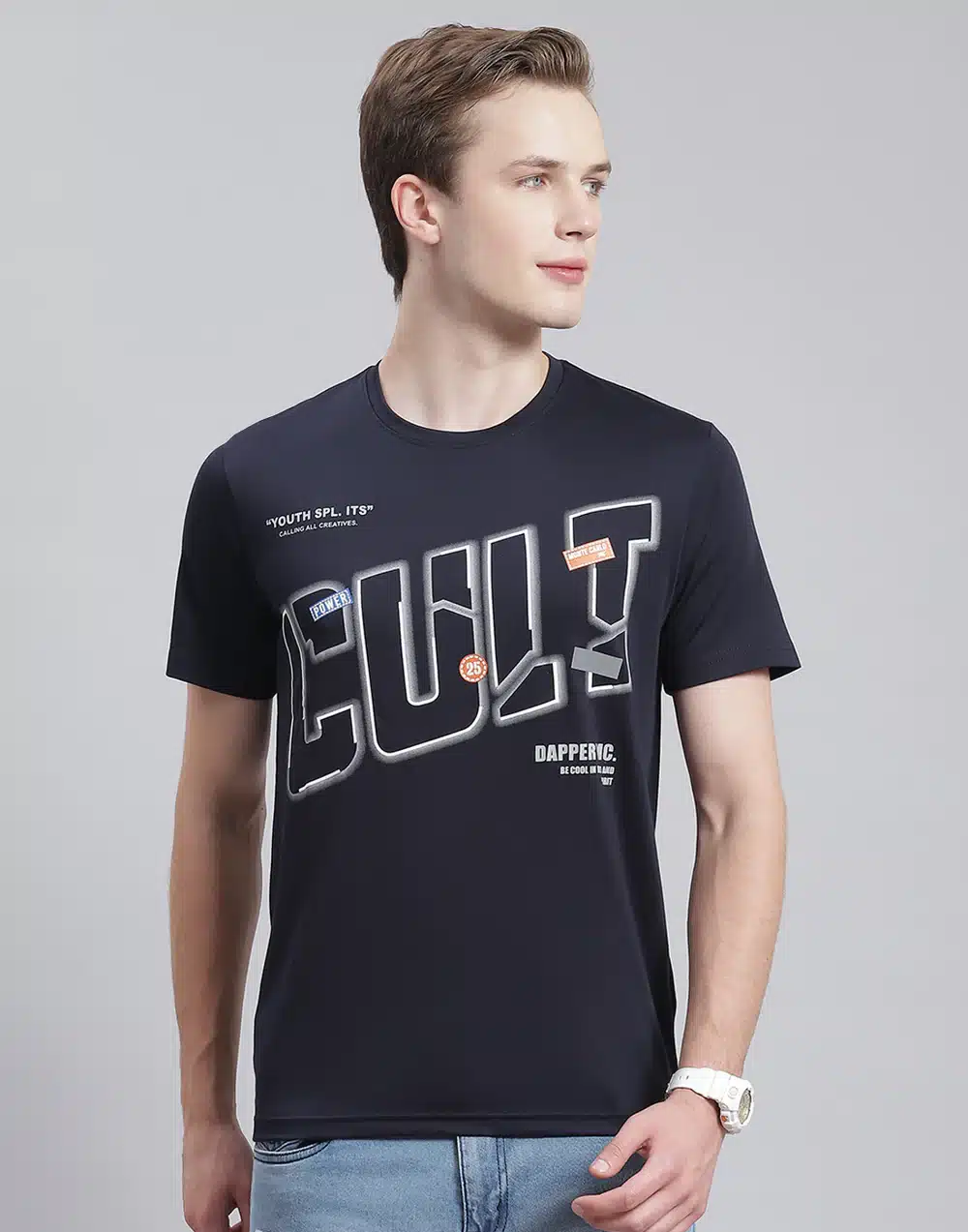 Men’s Navy Blue Printed Round Neck Half Sleeve T-Shirt. Crafted with meticulous attention to detail, this shirt effortlessly combines laid-back style with undeniable sophistication.