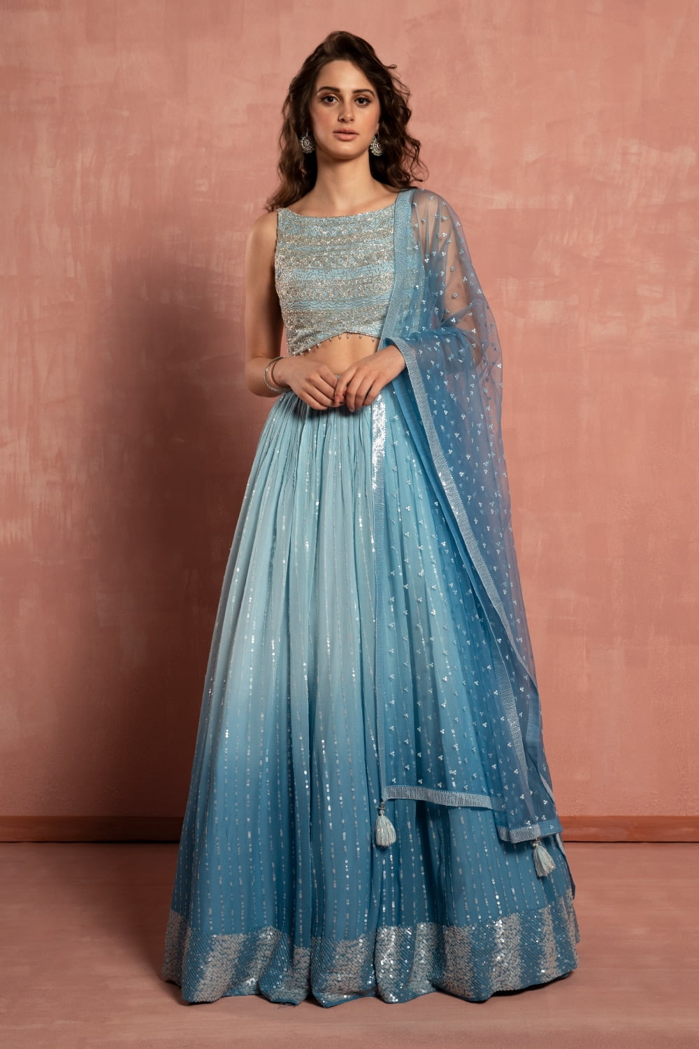 Crafted from luxurious fabric in a pastel blue ombré hue, the lehenga features a mesmerizing sequin pattern that adds a touch of sparkle and sophistication. The ombré effect transitions seamlessly from light to dark, creating a stunning visual impact that is sure to turn heads.