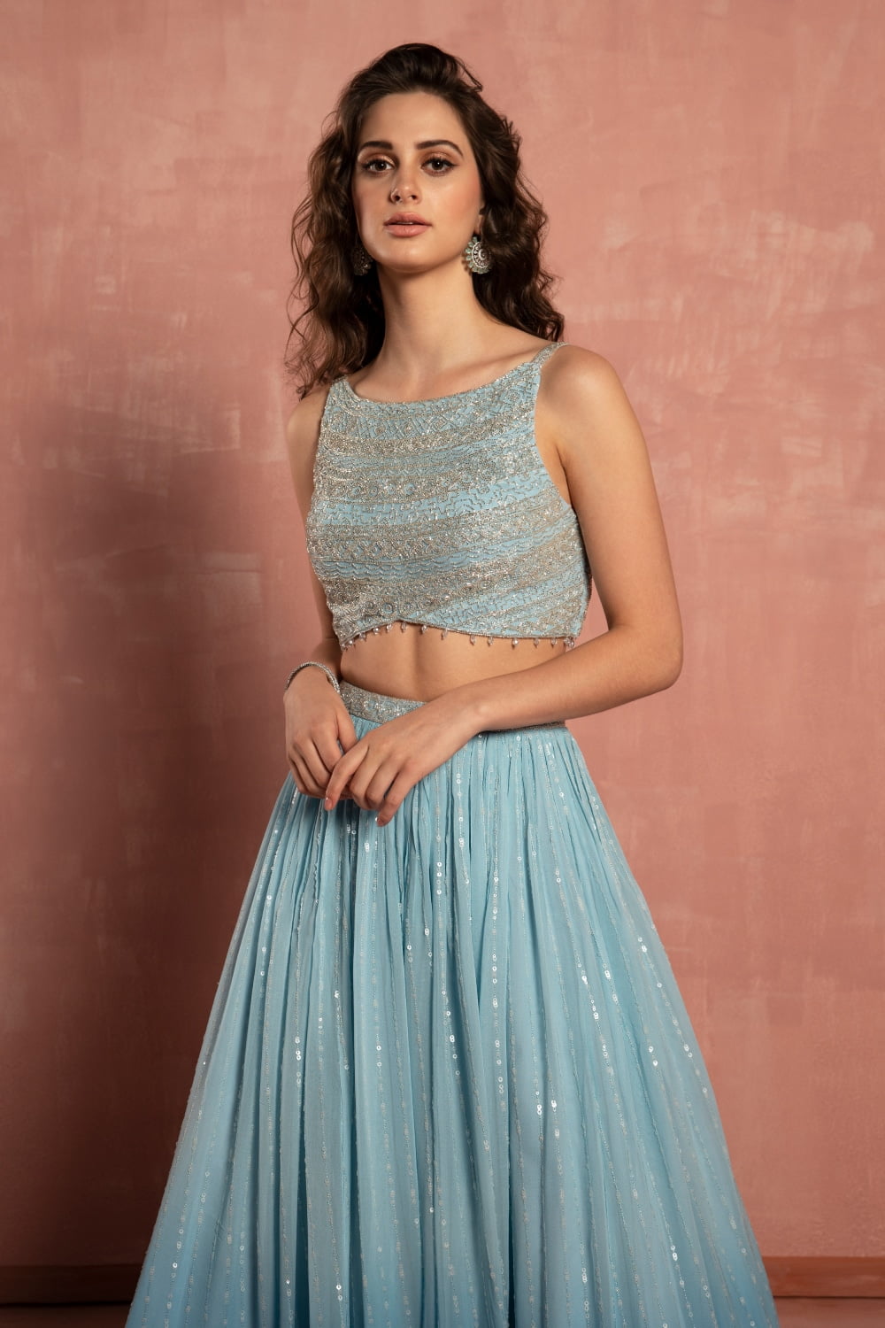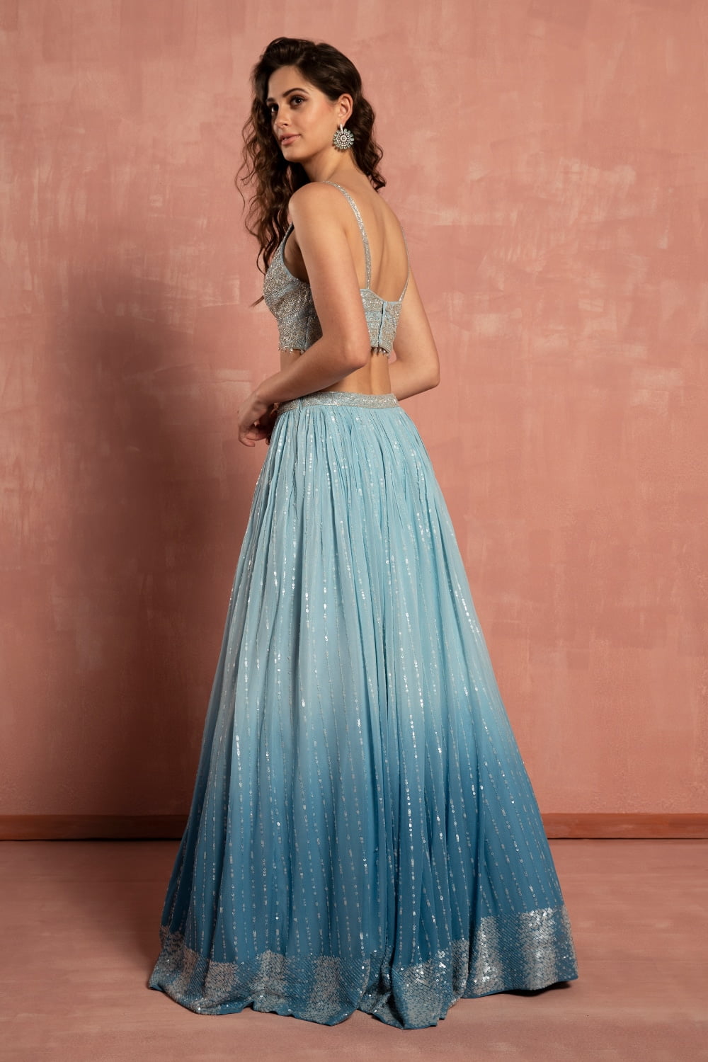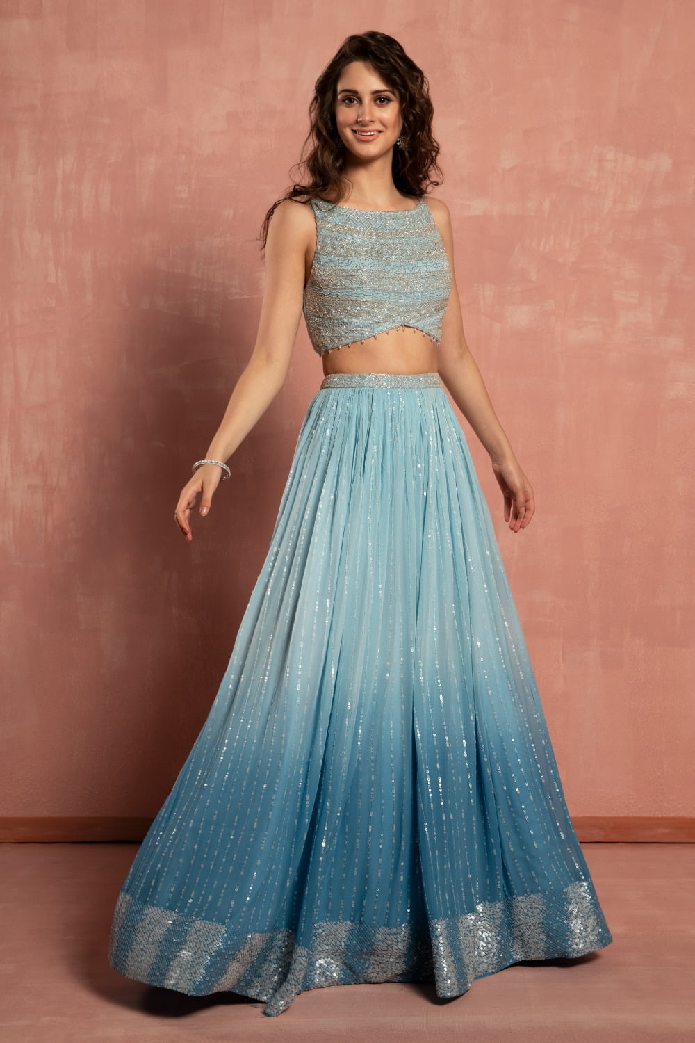 • Pastel blue ombré sequin patterned lehenga set.