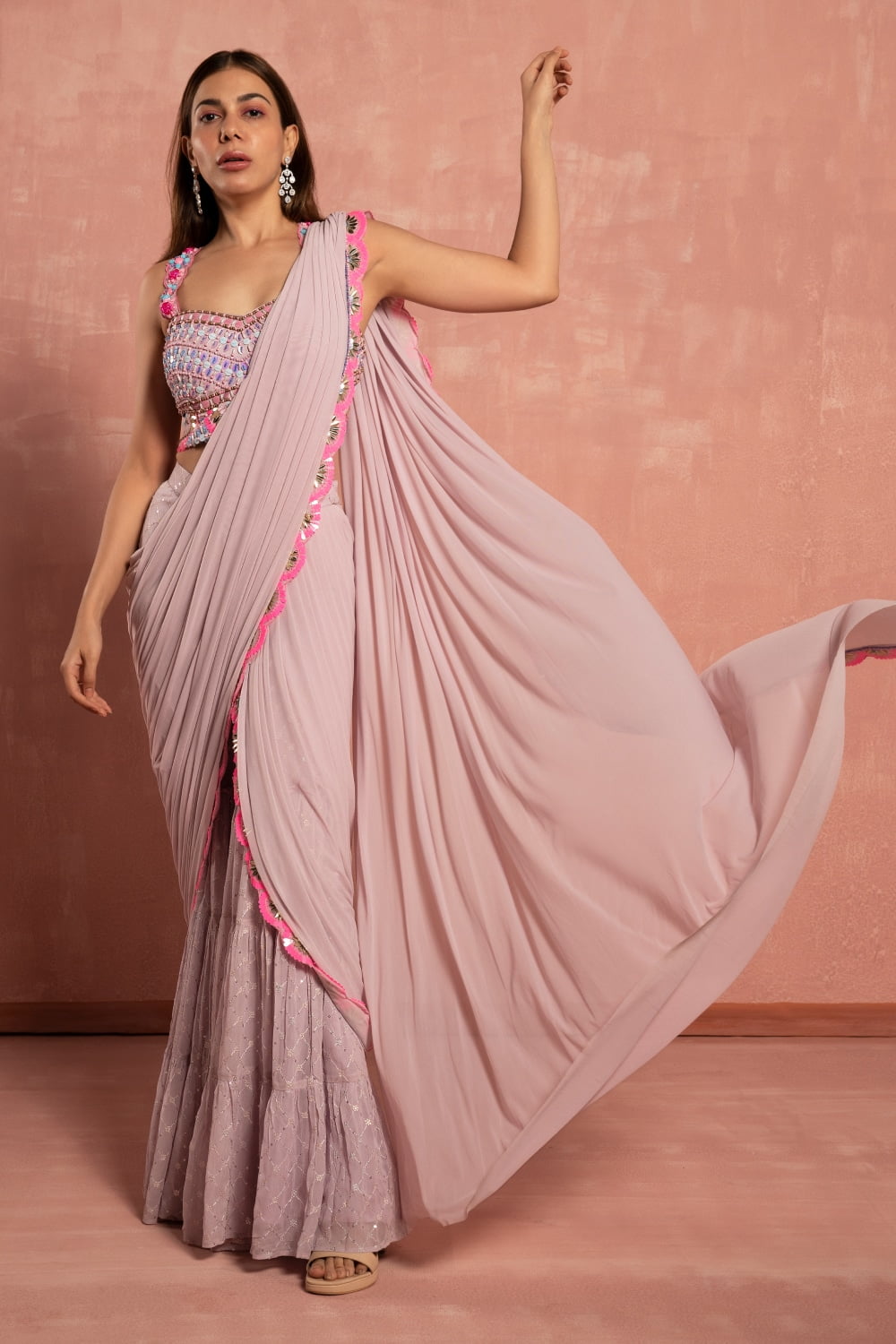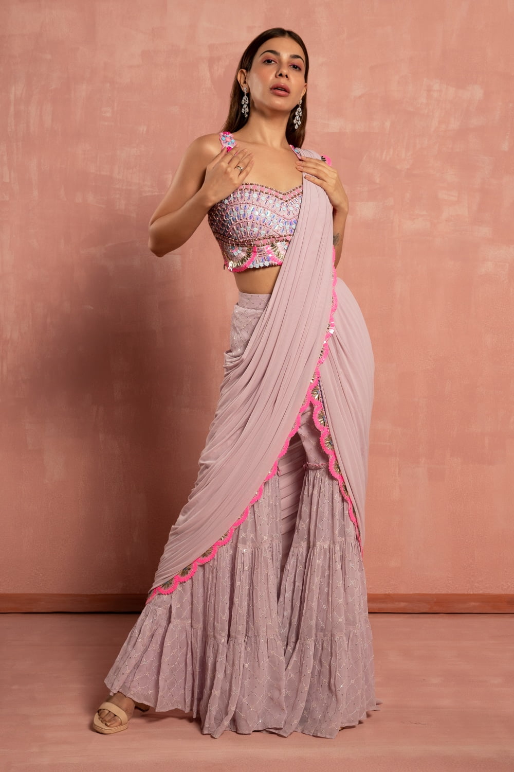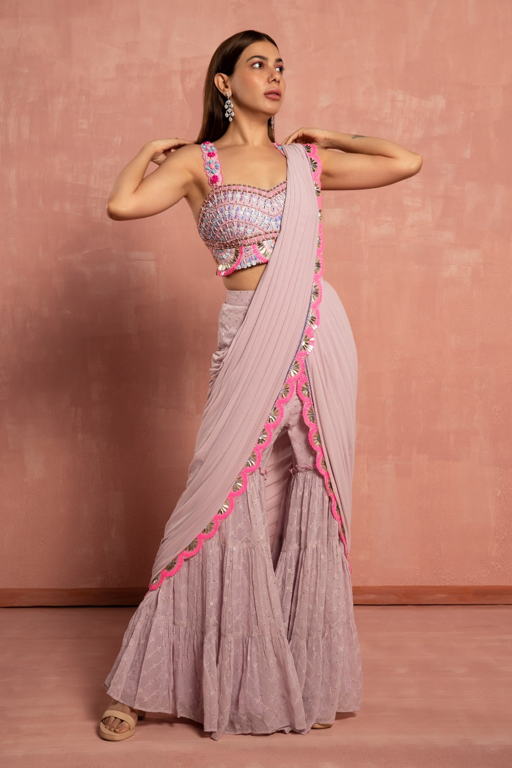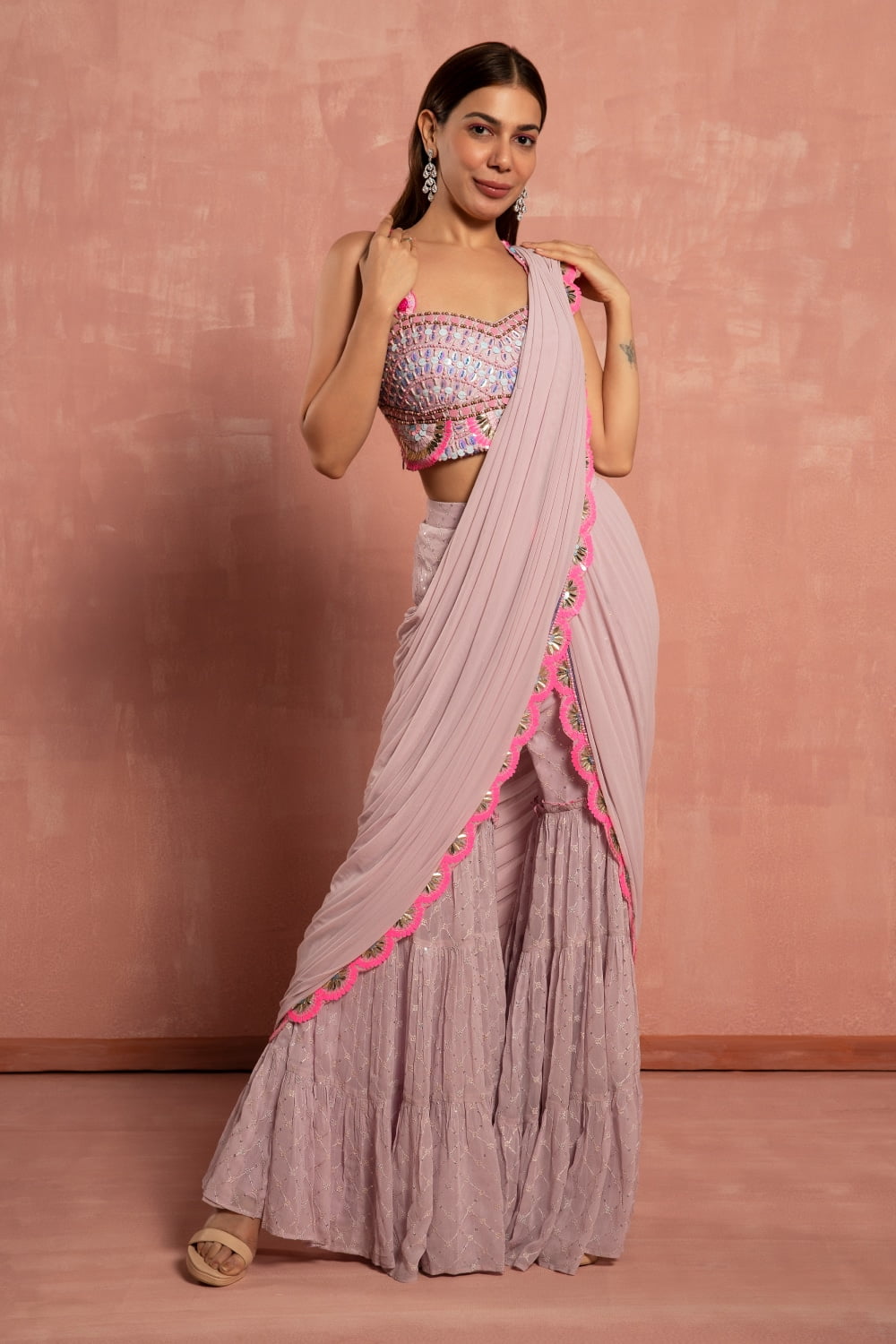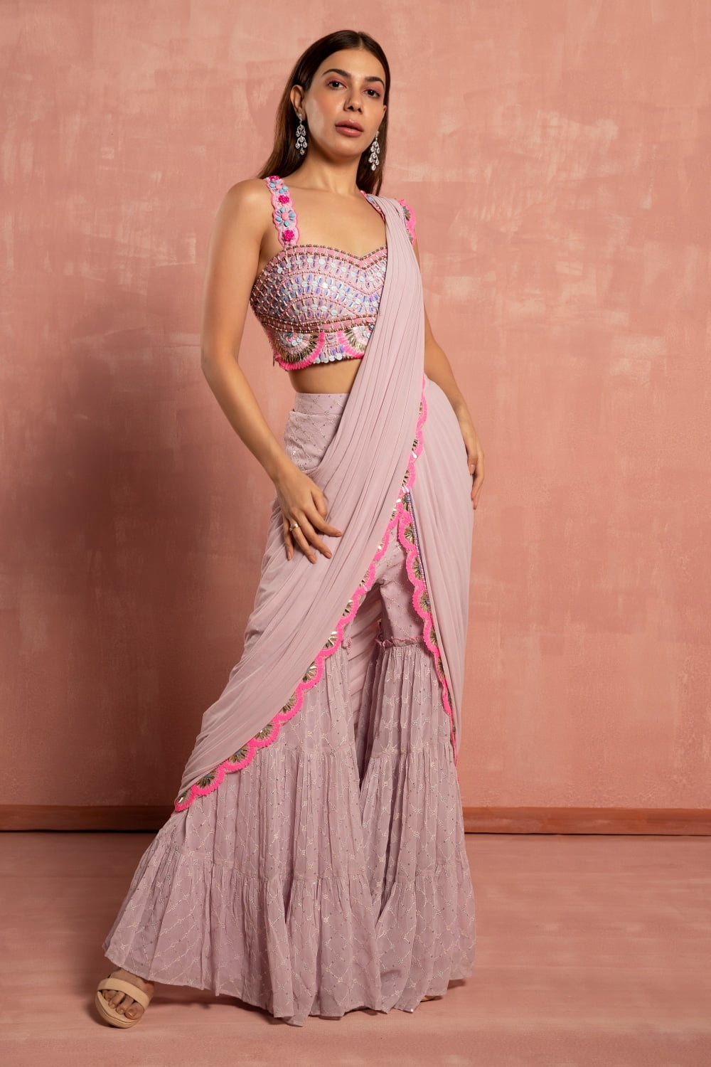 The delicate pastel lavender hue of the saree exudes femininity and charm, perfect for adding a touch of sweetness to your look. The tiered sharara pant design offers a modern twist on the classic saree silhouette, providing comfort and ease of movement while exuding an air of sophistication.
