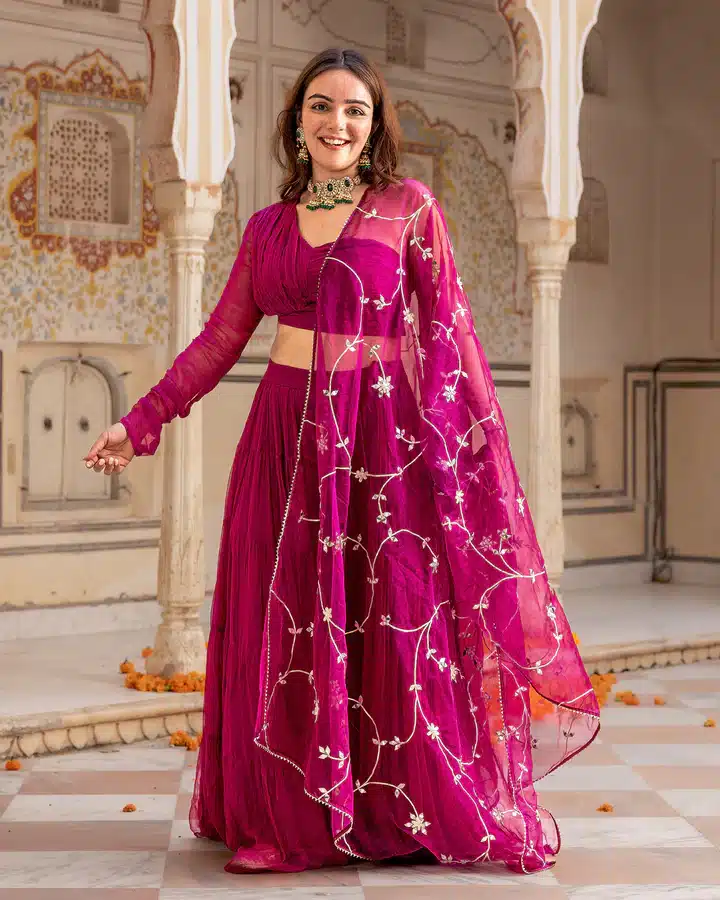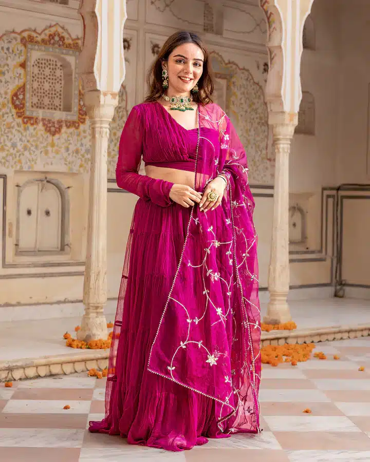 But it’s not just about the Lehenga and Choli – the ensemble is elevated to new heights with the addition of a matching Dupatta. Draped effortlessly over the shoulder, it adds a sense of ethereal beauty and completes the ensemble with its sheer elegance.