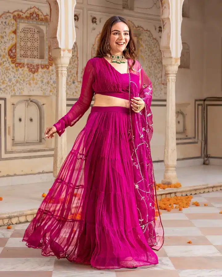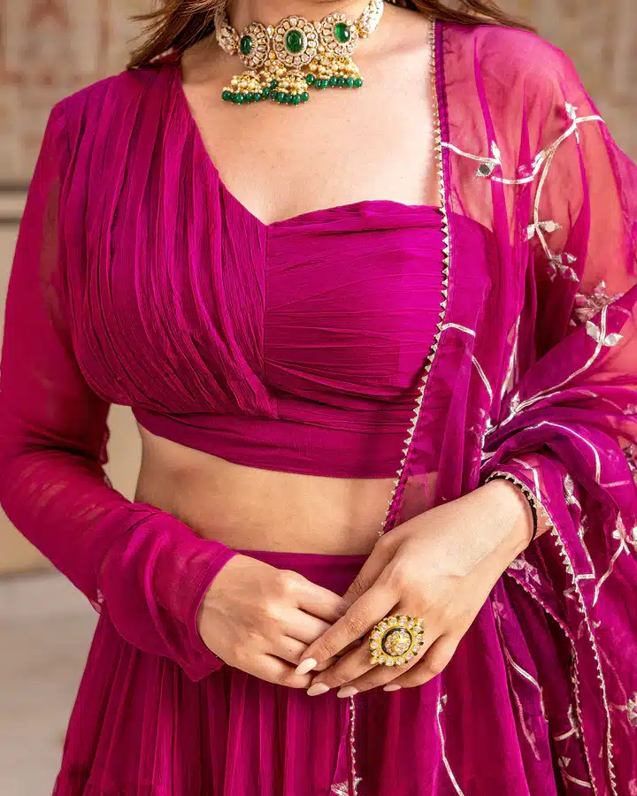 Perfect for weddings, receptions, or any special occasion, the Pink One-Shoulder Lehenga Set is a statement piece that commands attention and leaves a lasting impression. Embrace the fusion of tradition and modernity, and let your confidence shine as you grace the occasion with effortless style and grace.