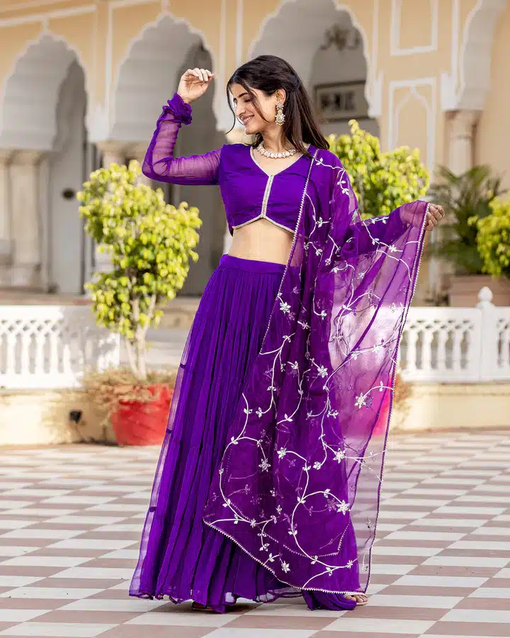 Crafted in a regal shade of purple, reminiscent of royalty and sophistication, this lehenga set exudes a sense of grandeur and opulence. The rich hue complements all skin tones, creating a radiant glow that enhances your natural beauty.