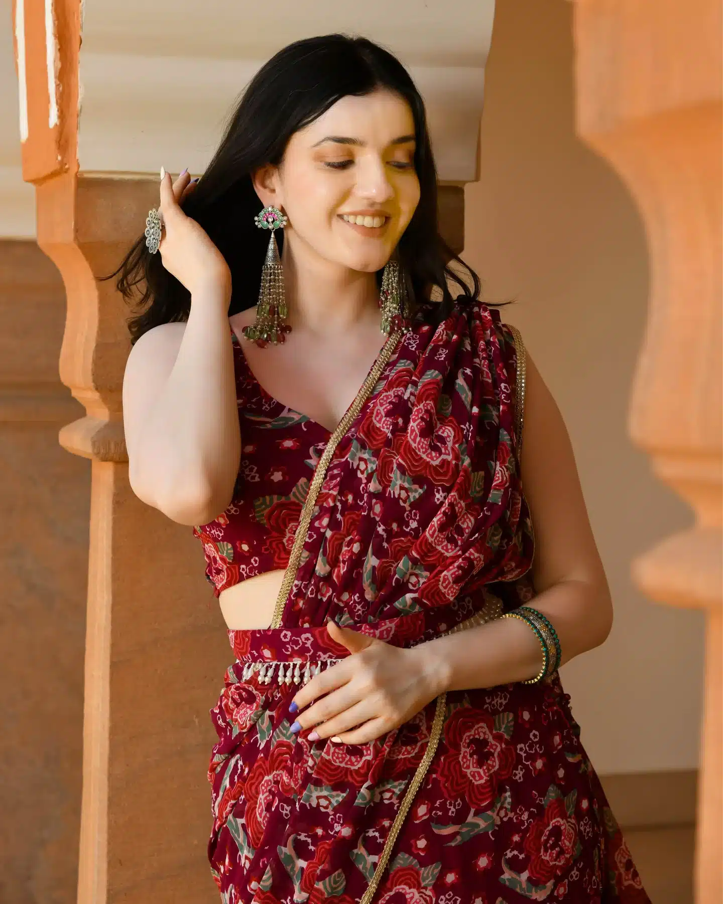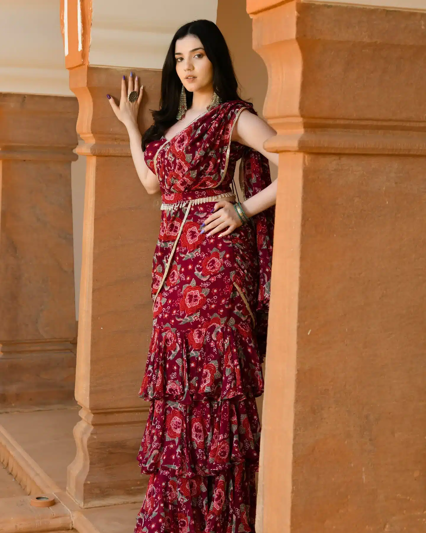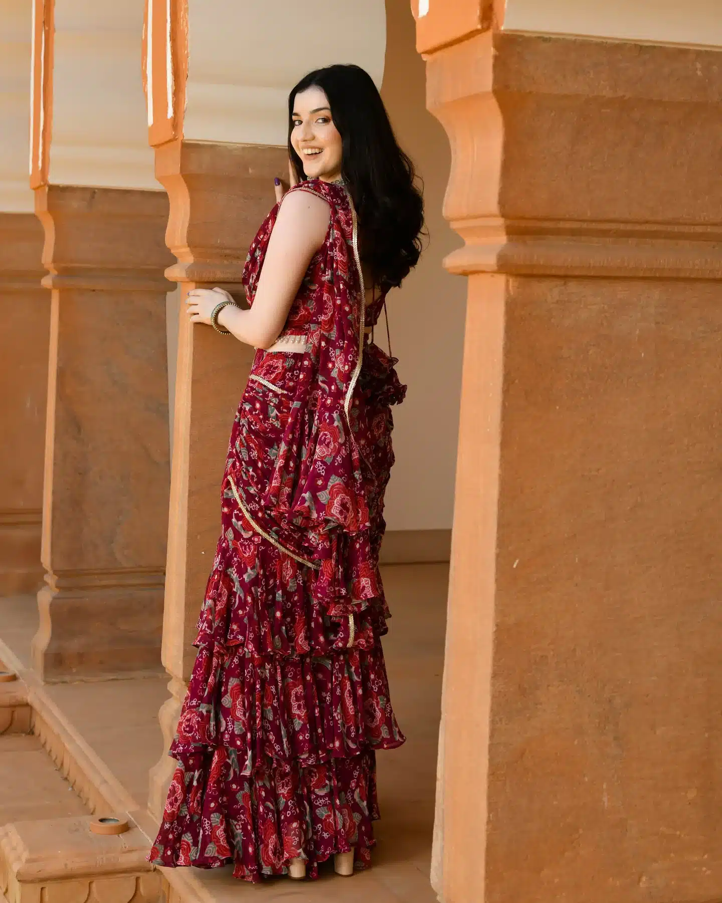 The pre-draped design adds an element of modernity and sophistication, eliminating the need for intricate pleating and tucking. Simply slip into this exquisite ensemble and you’re ready to captivate with your effortless style.