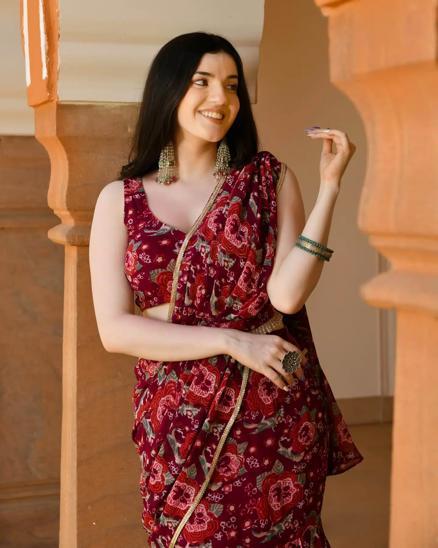 Raina Georgette Pre-Draped Saree, a stunning ensemble that combines the fluidity of georgette fabric with the convenience of pre-draped styling.