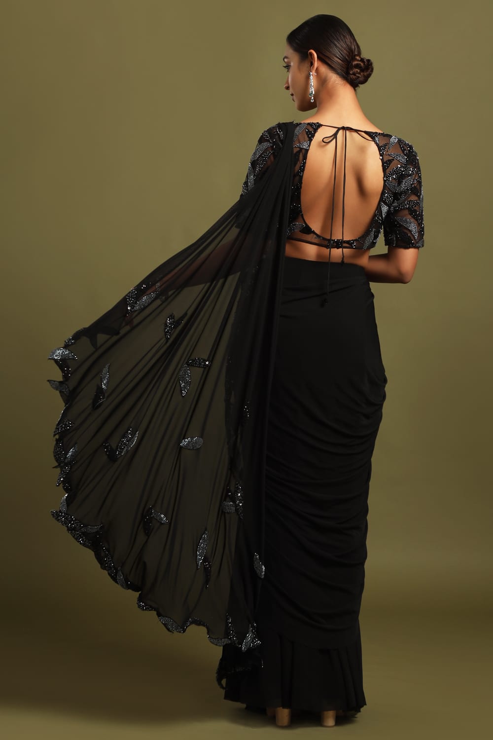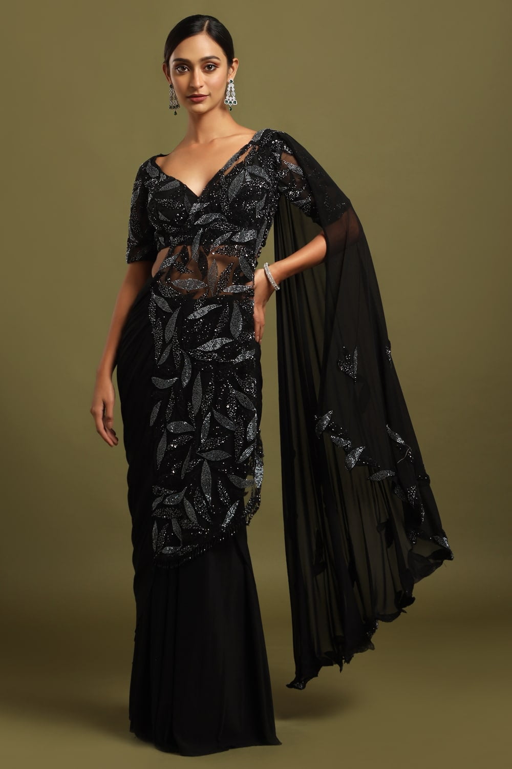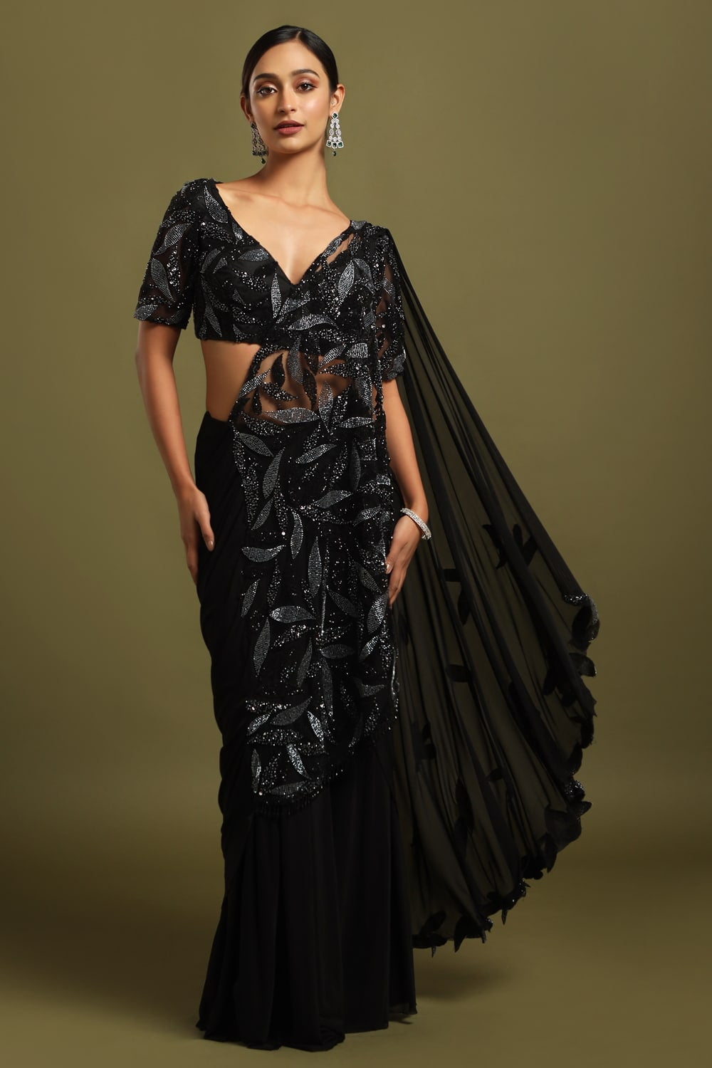 Raven Black Draped Pre-Stitched Saree, a stunning ensemble exuding timeless elegance and modern sophistication, accentuated by a captivating black and grey beadwork pallu.