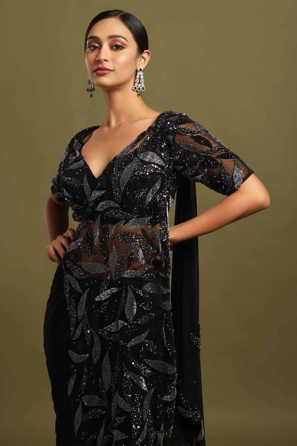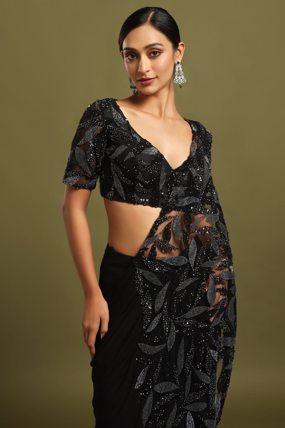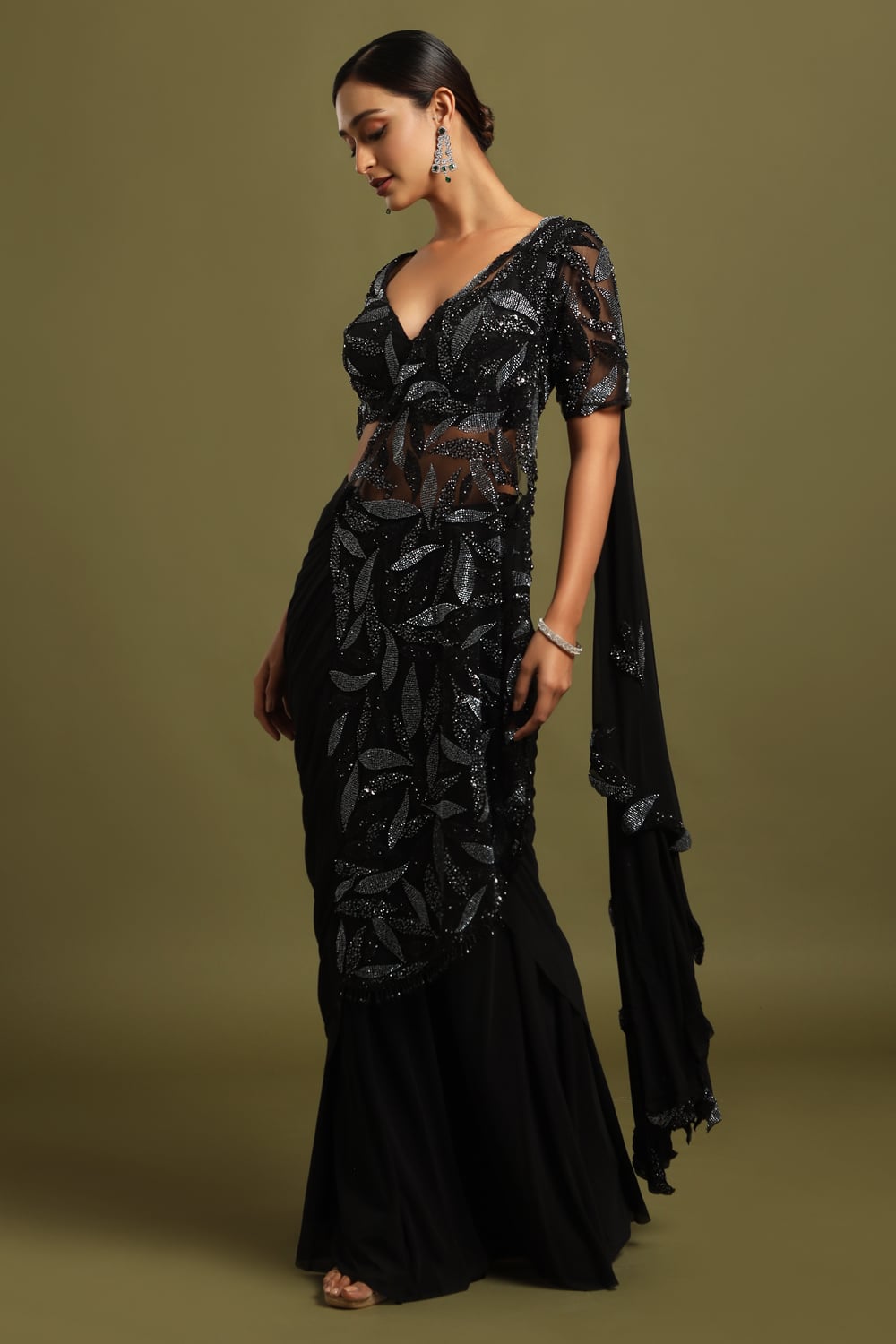 Raven Black Draped Pre-Stitched Saree, a stunning ensemble exuding timeless elegance and modern sophistication, accentuated by a captivating black and grey beadwork pallu.