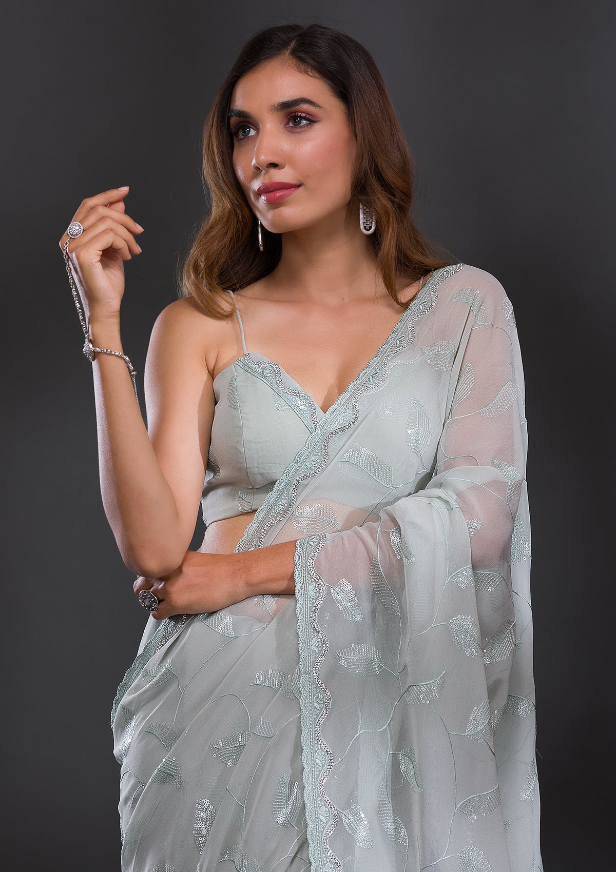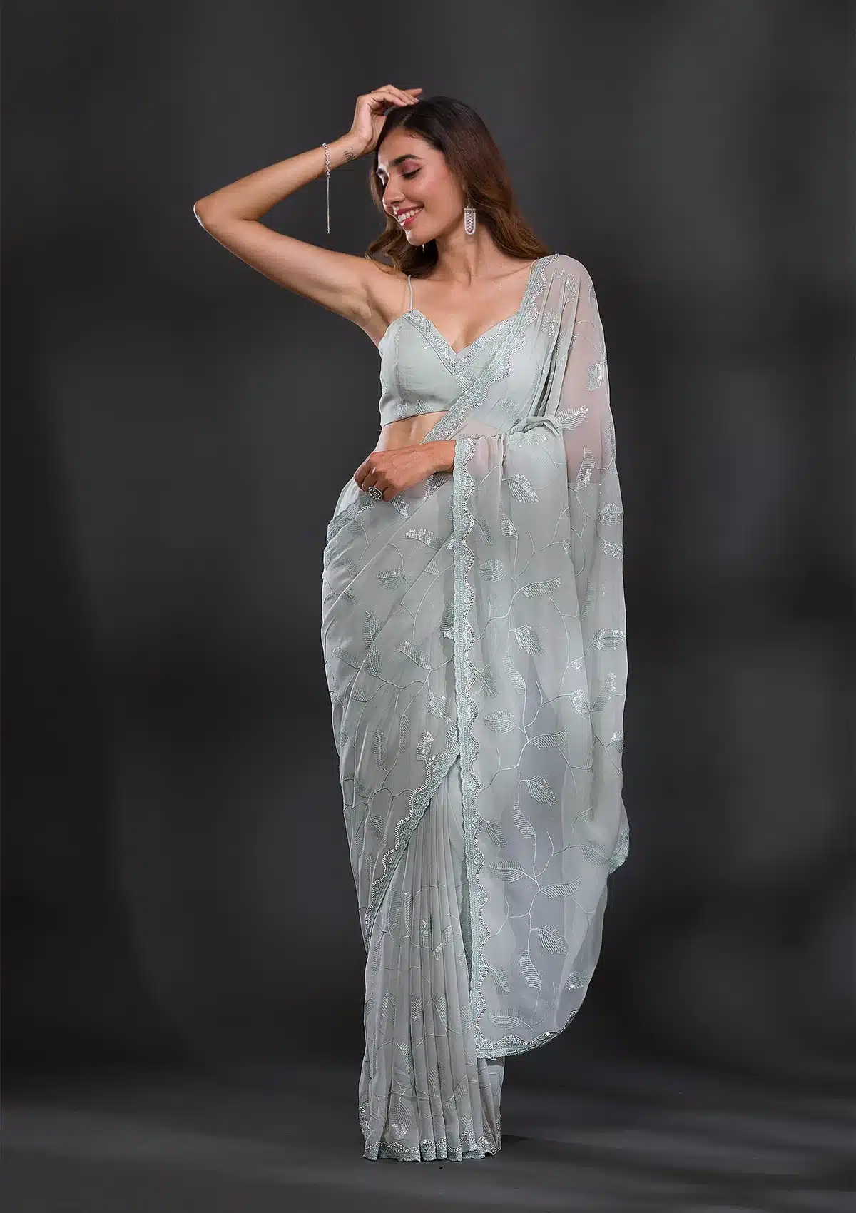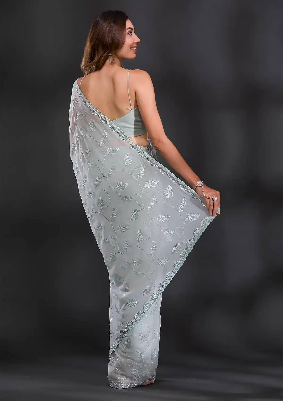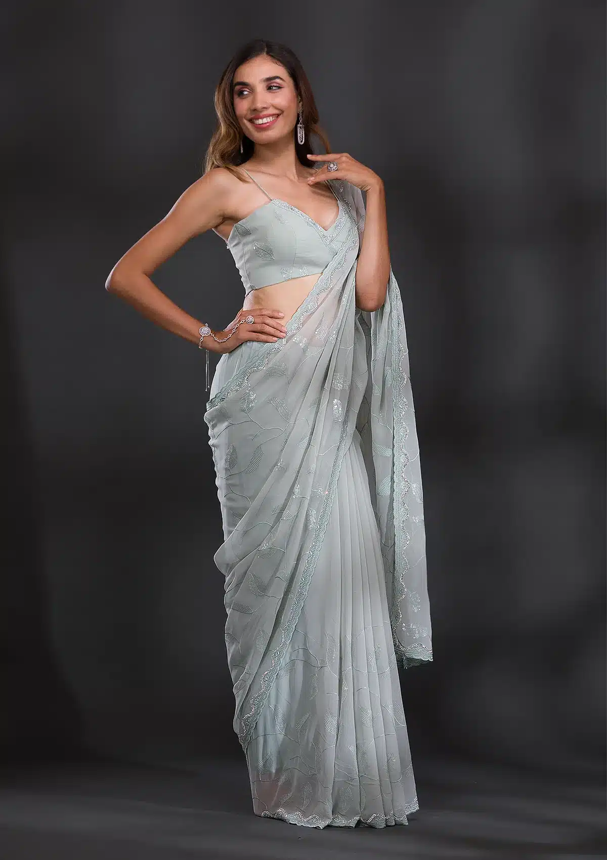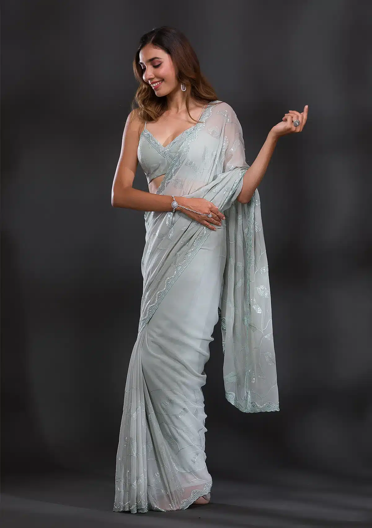 Adorned with shimmering sequins, this saree sparkles and shines with every movement, creating a mesmerizing effect that is sure to turn heads. The delicate sea green hue of the saree evokes a sense of tranquility and freshness, perfect for making a statement at any special occasion.