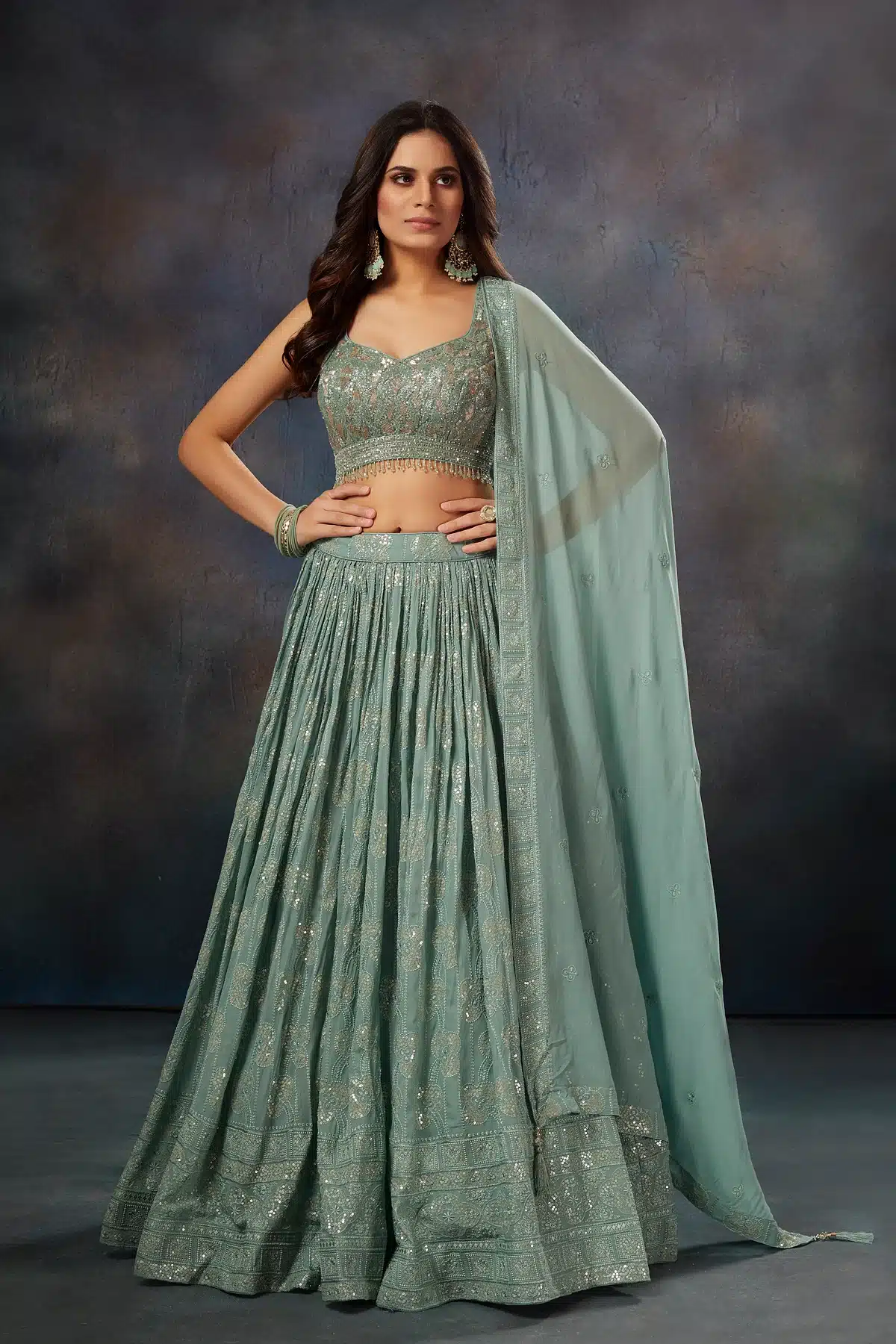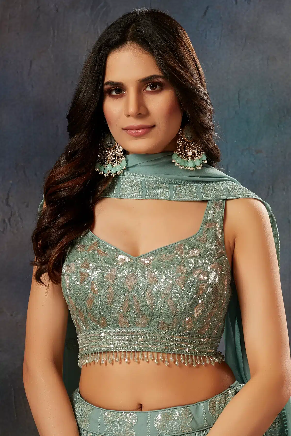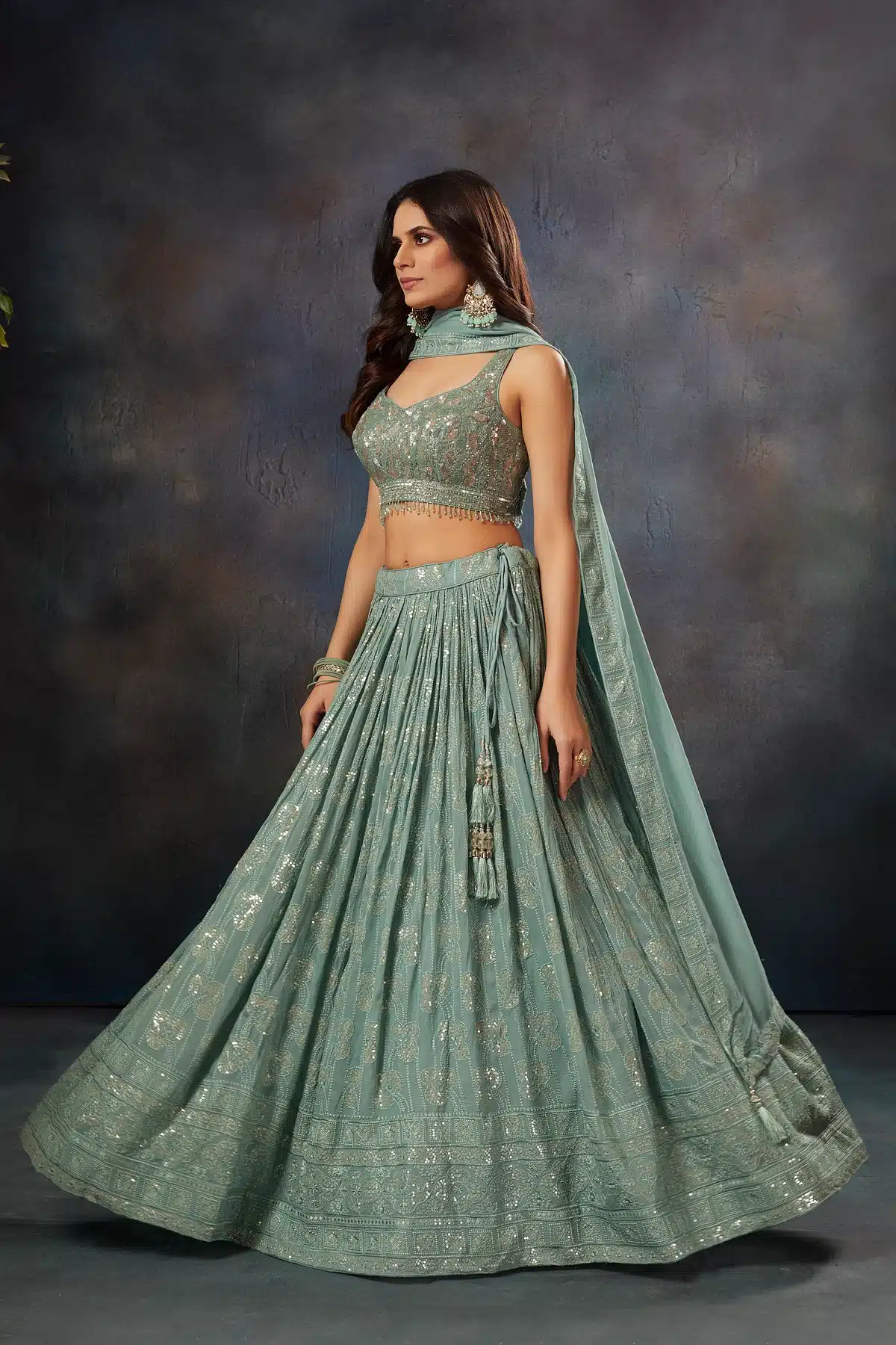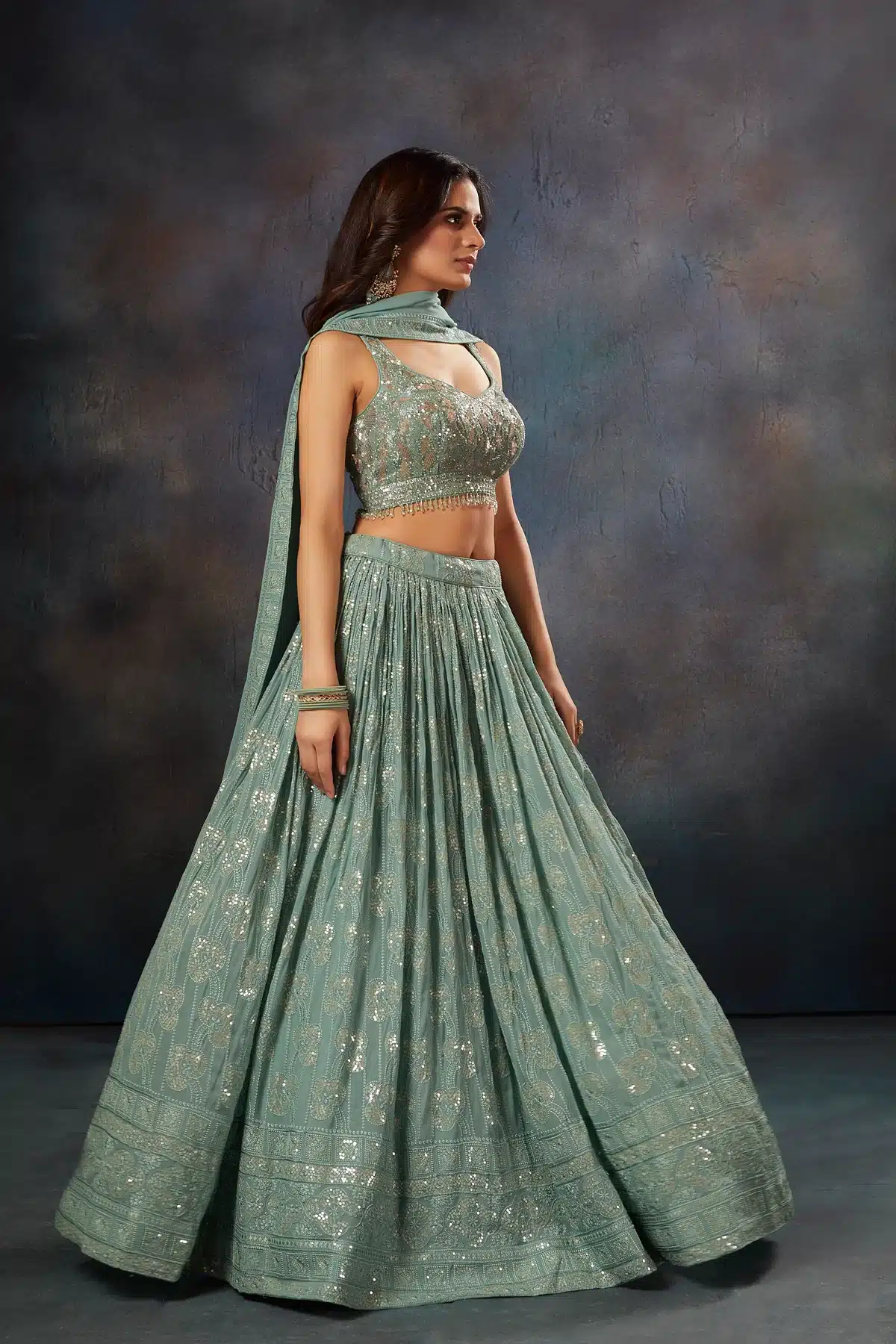 Smoke Green Sequins Embroidered Georgette Sangeet Lehenga