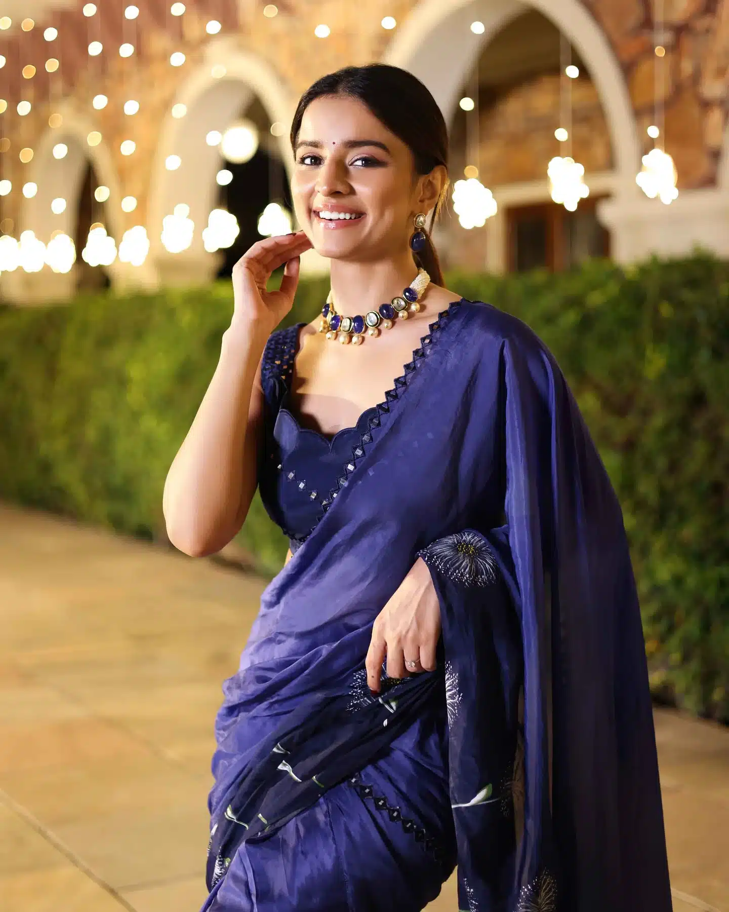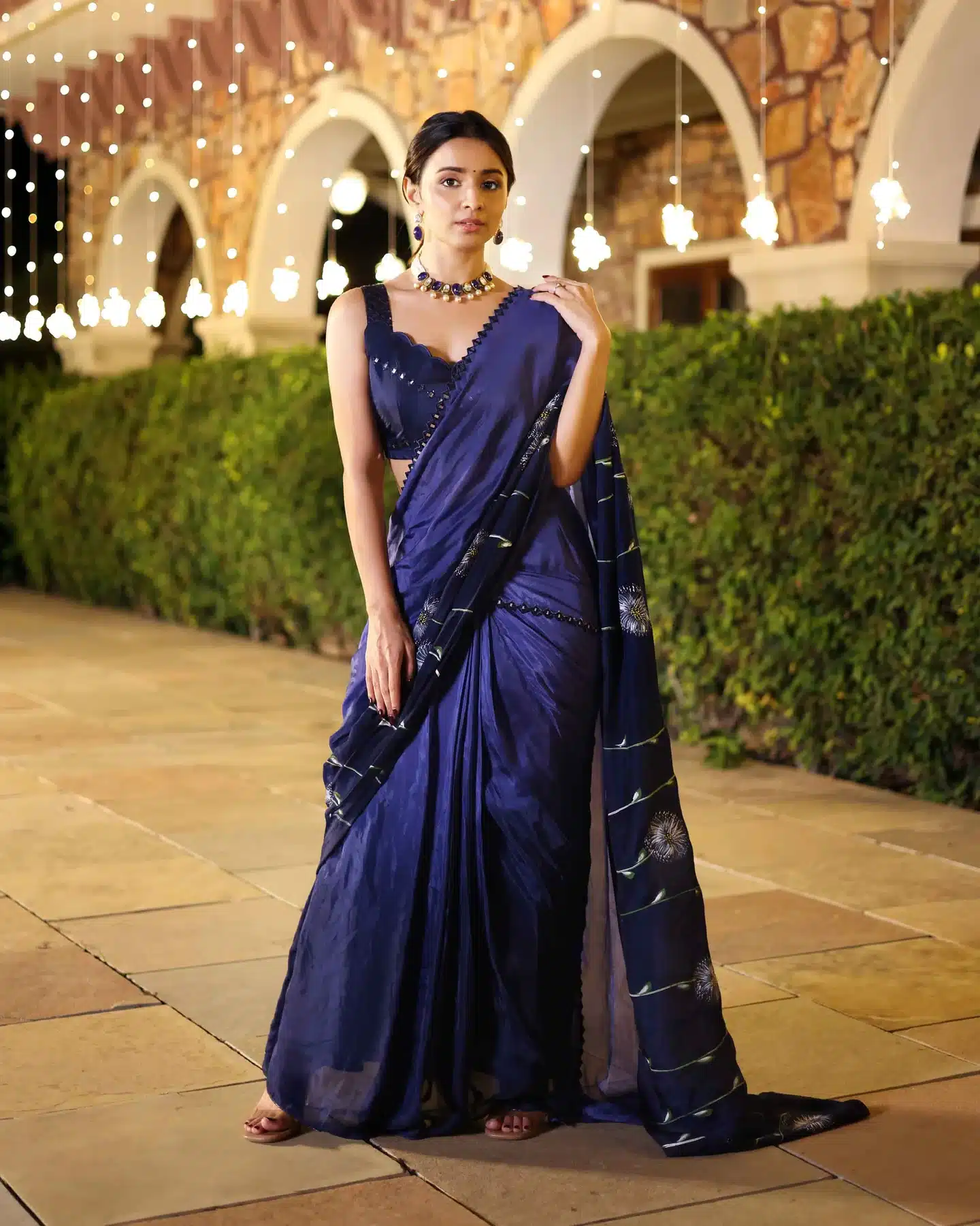 Complete with a matching blouse adorned with mirror work and hand-painted accents, this saree set is a testament to the beauty of traditional craftsmanship and contemporary design. Embrace the magic of our Swish Blue Ombre Mirror Work Hand-painted Silk Pre-Draped Saree and embark on a journey of style and sophistication that is sure to turn heads and steal hearts wherever you go.