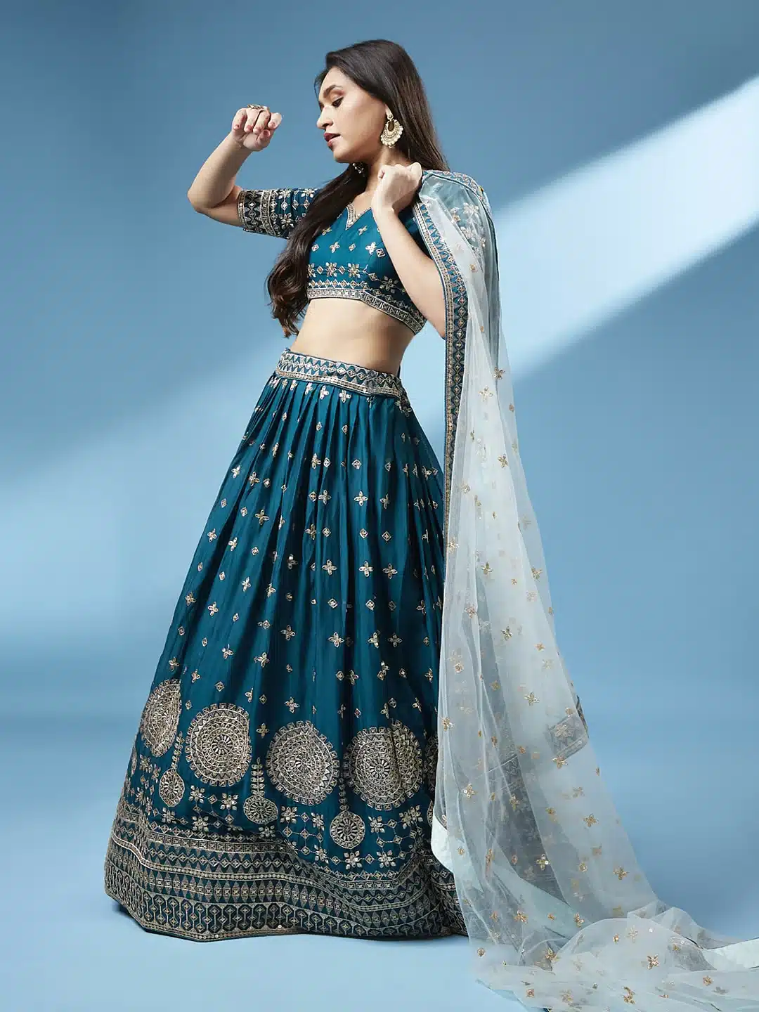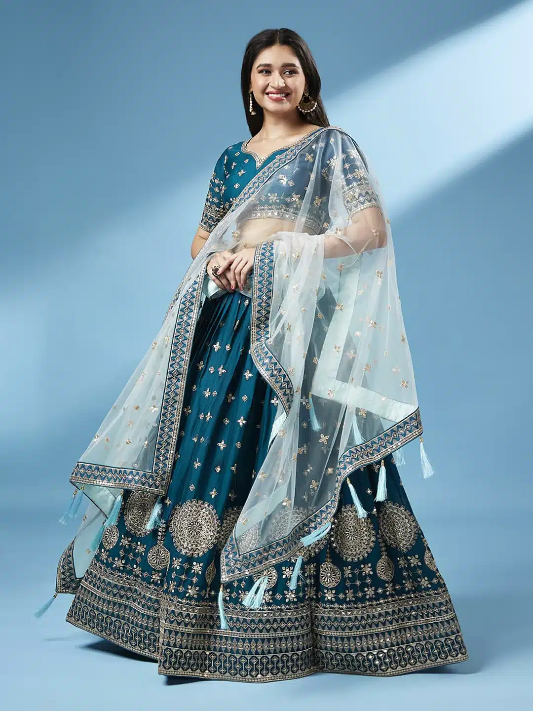 Whether you’re the bride-to-be or a guest of honor, the Teal Poly Georgette & Net Wedding Wear Lehenga Choli is sure to turn heads and steal hearts. Embrace its timeless beauty and let it be a reflection of your exquisite taste and undeniable charm on your special day.