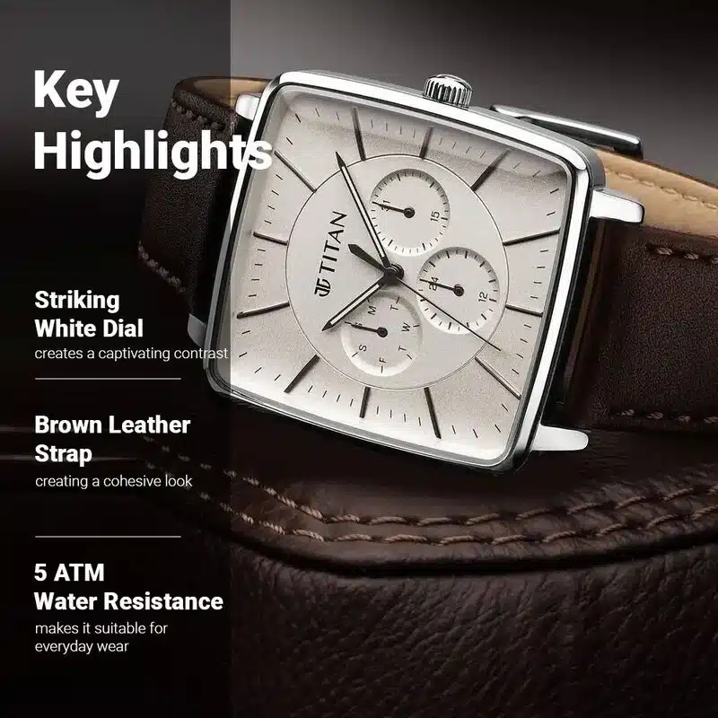Titan Avant Garde Quartz Multifunction Silver Dial Leather Strap Watch for Men – a timeless masterpiece that blends classic elegance with modern functionality, redefining what it means to wear a sophisticated timepiece. Crafted with meticulous attention to detail, this watch is the epitome of refined style and versatility.