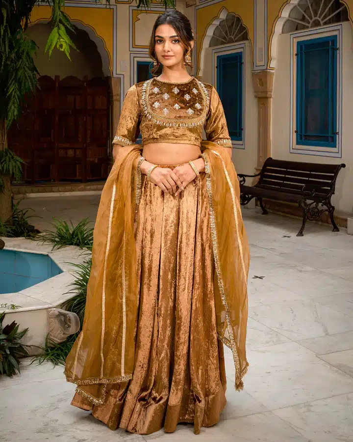 Crafted in a rich umber hue reminiscent of earthy warmth, this kalidaar lehenga exudes a sense of understated luxury. The lustrous fabric drapes elegantly, creating a silhouette that flatters and enhances your natural beauty.