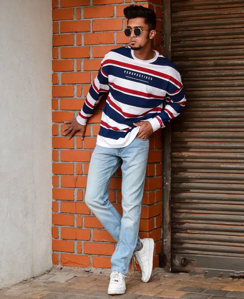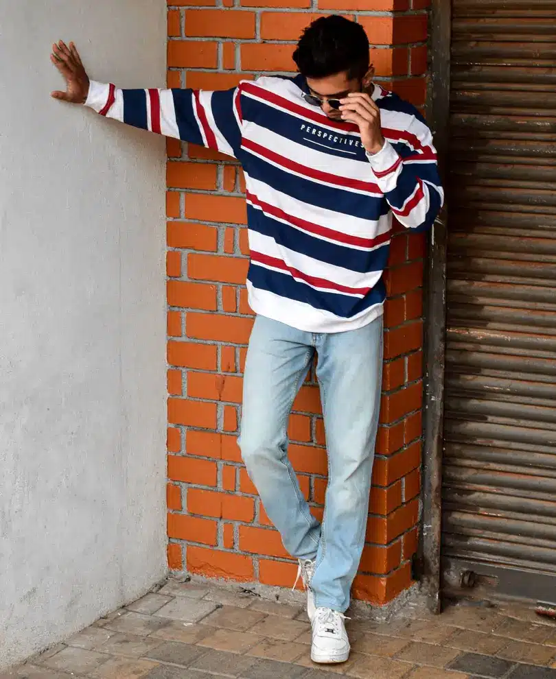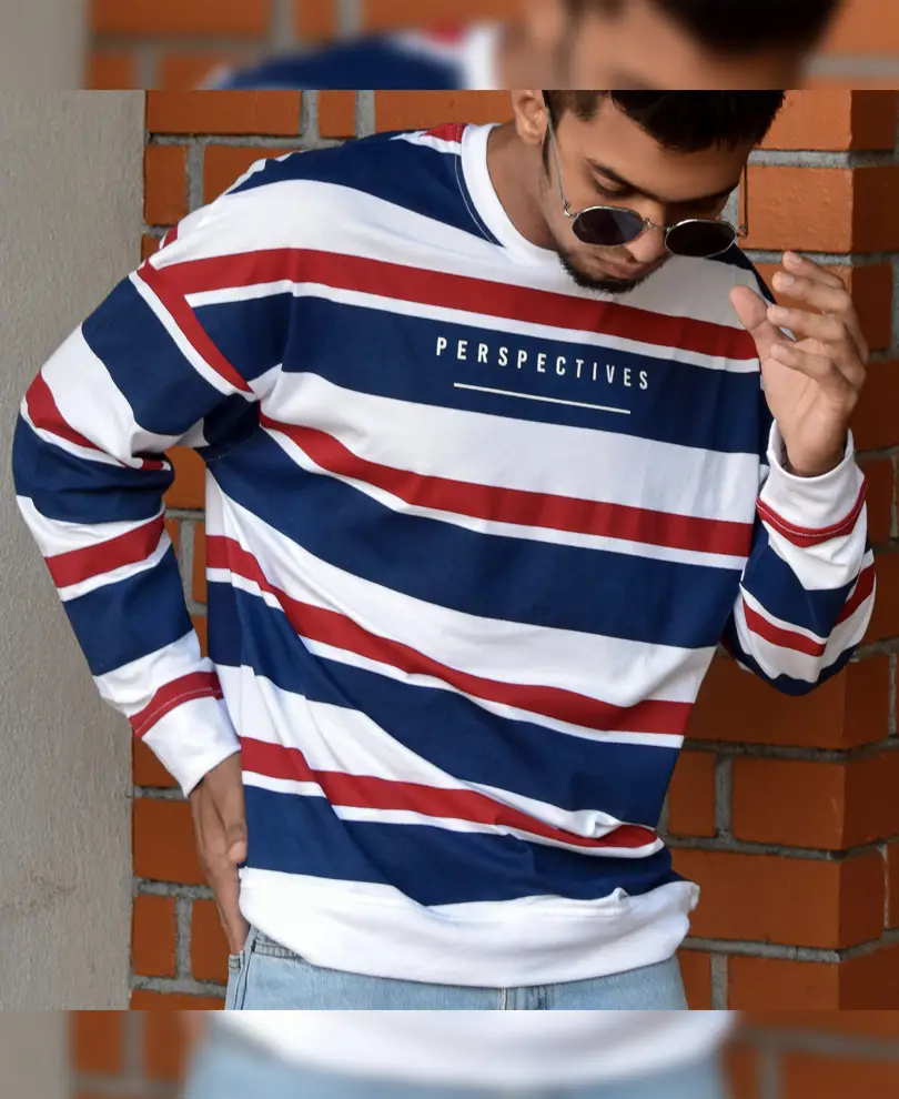So, embrace the unexpected, embrace the stripes, and elevate your look with the White and Blue Perspectives Stripe Oversize Drop Shoulder T-Shirt – because true style knows no boundaries.